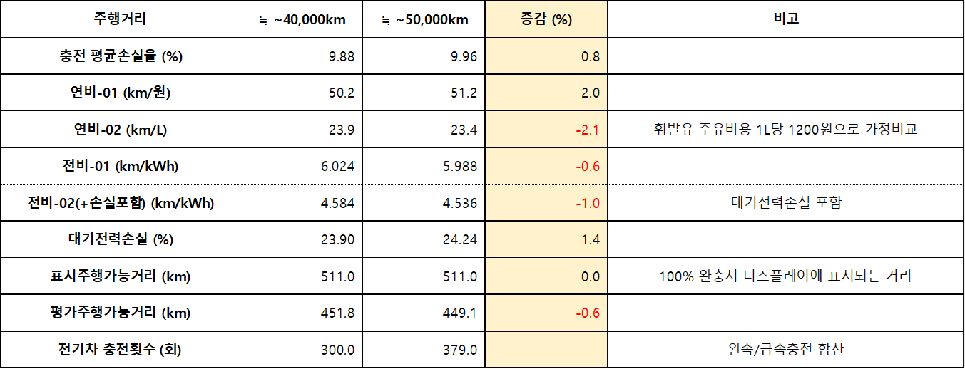 ※ 위 표에서 계산된 수치값은 테슬라 데이터와 서드파티앱들의 데이터를 수기로 기재한 Raw Data들로 오차는 있으니 감안하여 볼 것