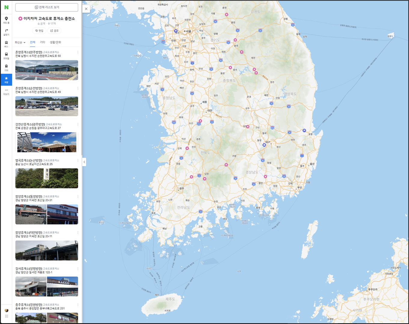 그래서 언제 어디서나 네이버지도에서 전국 고속도로 휴게소에 설치된 이지차저(Easy Charger) 전기차 충전소를 검색할 수 있도록 리스트 만들기 기능을 사용하여 지도를 개인적으로 만들어 봤다.
