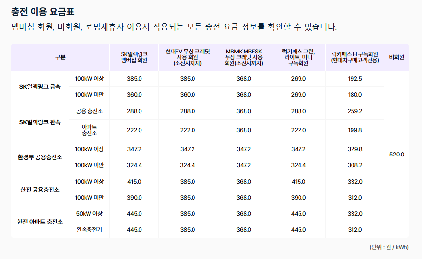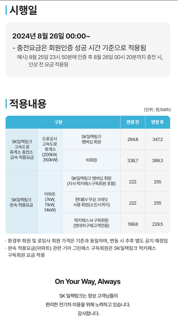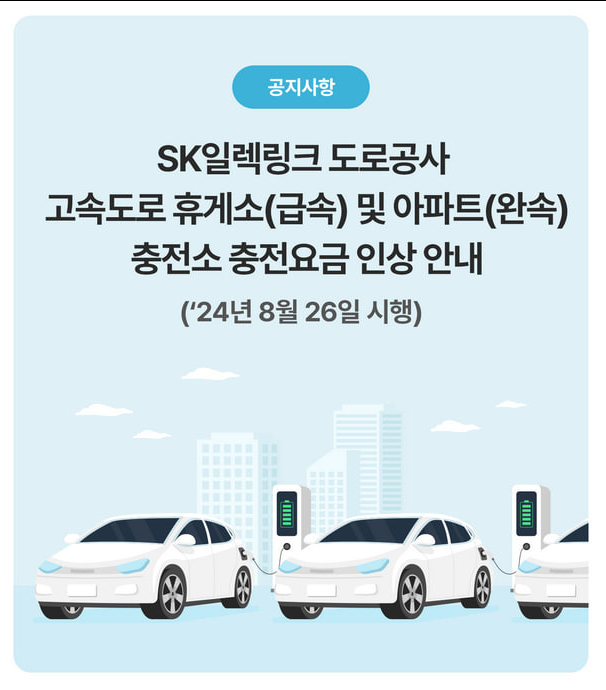 SK일렉링크의 고속도로 휴게소 및 아파트 충전소 전기차 충전요금이 2024년 8월 26일부로 인상된다.