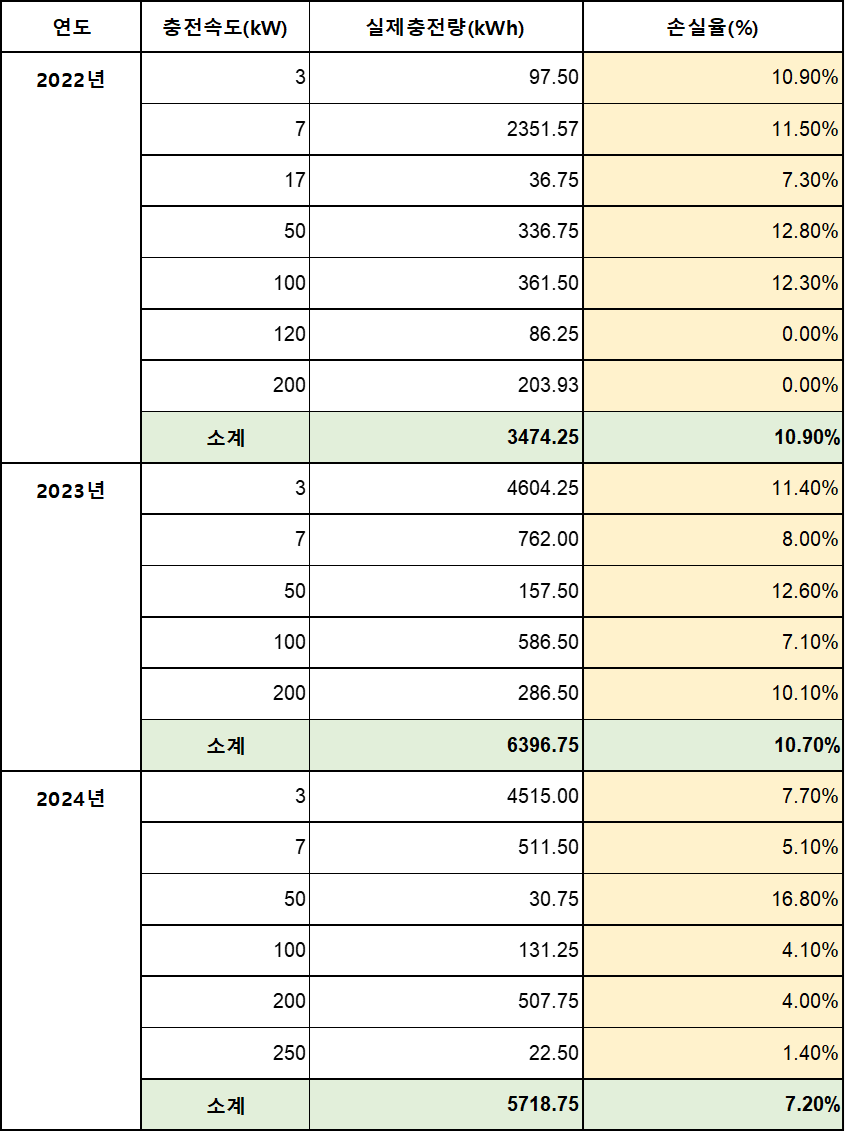 08. 충전속도별 충전손실율을 비교해 본다면 완속에서는 7kWh, 급속에서는 250kWh급에서 가장 효율이 좋았음.