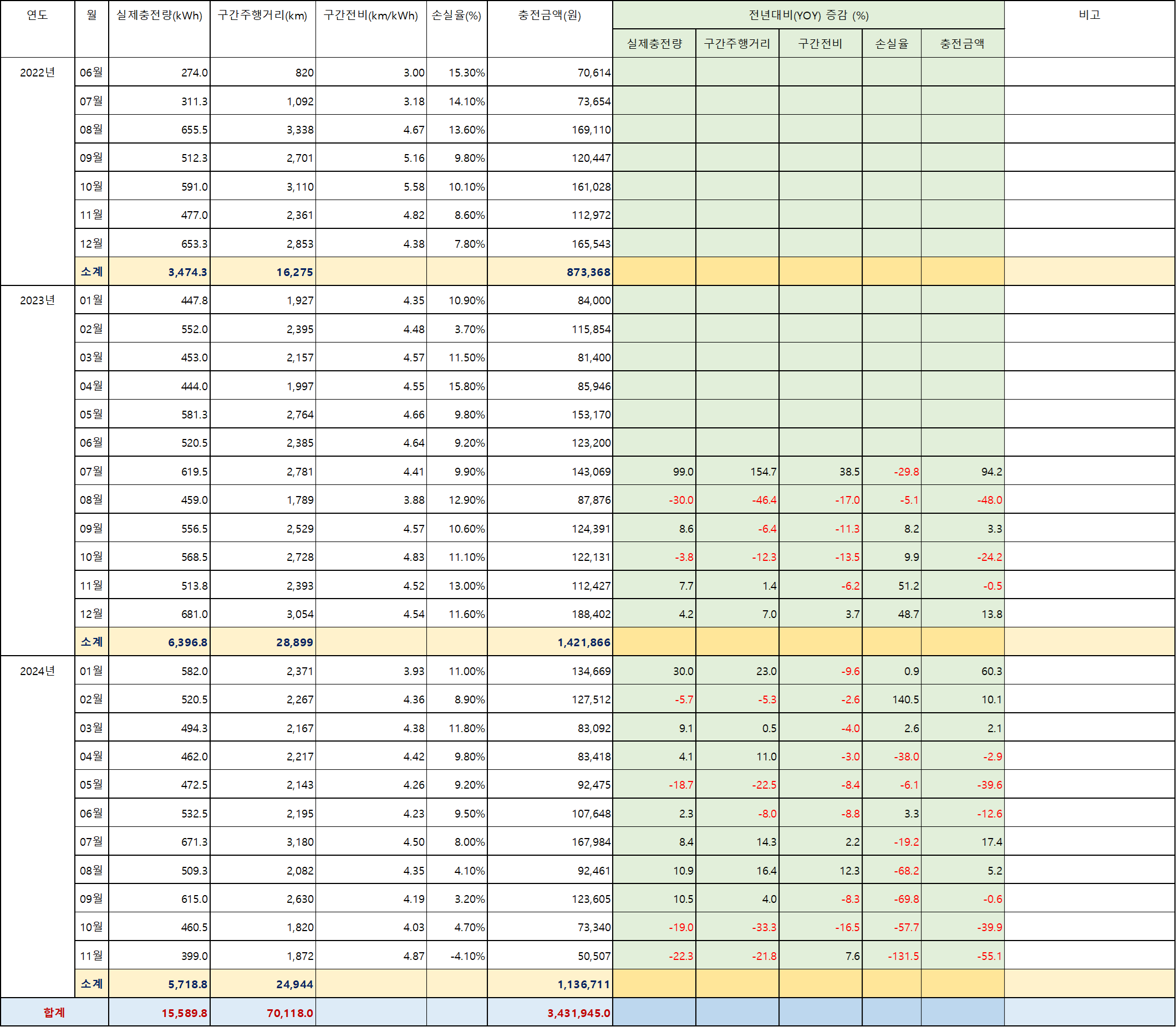 06. 전년동월대비 구간전비는 대략 평균적으로 -4% 정도로 저하되었으나 충전손실율은 약 22% 정도로 효율이 개선됨. 앞서 언급했듯이 3kWh 저속충전기를 주로 사용하면서 손실율이 크게 개선된 것으로 생각됨. 특히 무더운 여름이었던 7~9월에 큰 폭의 충전손실율 개선을 보였음