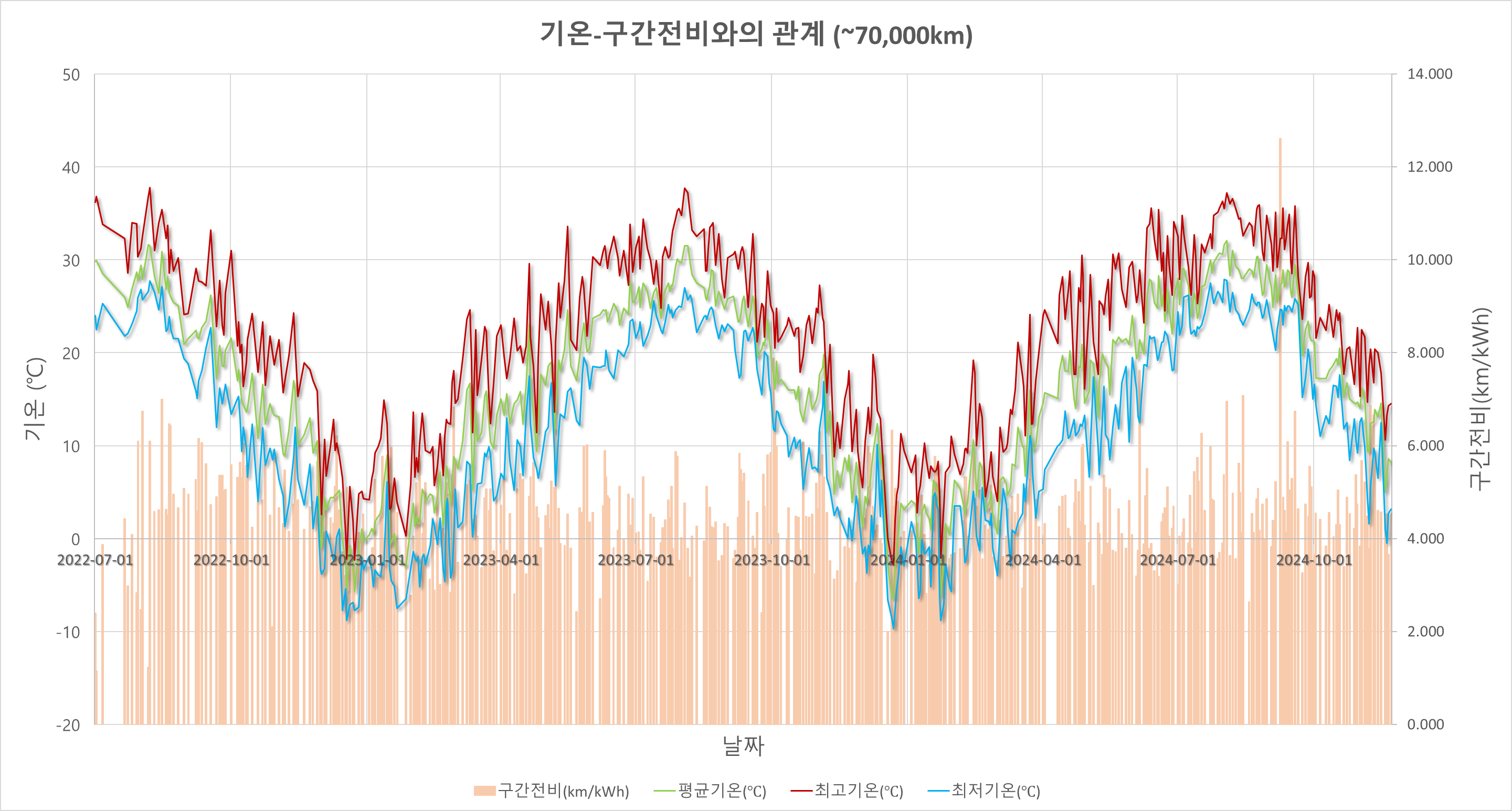 16. 시계열 그래프로 온도변화를 2023년과 비교해 본다면 2024년도 온도는 거의 비슷하다고 보여짐. 2024년의 여름 날씨였던 7~9월간 전비는 2023년보다 좋았음. 같은 기간, 주행거리도 2023년보다 많았고 높은 온도에 노출된 시간이 많았음에도 전비는 개선되었음