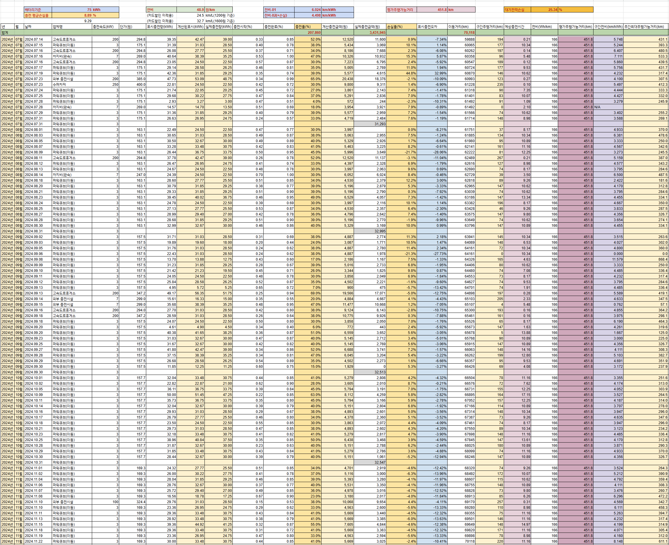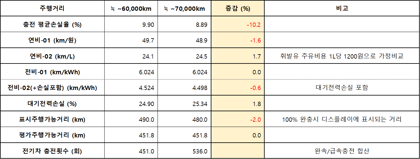 01. 충전 평균손실율이 10.2%로 크게 감소됨. 주된 이유를 알 수 없지만 지하주차장에 설치된 3kWh 충전기를 주로 사용하면서 열발생에 의한 충전손실이 크게 줄어든게 아닌가 생각됨