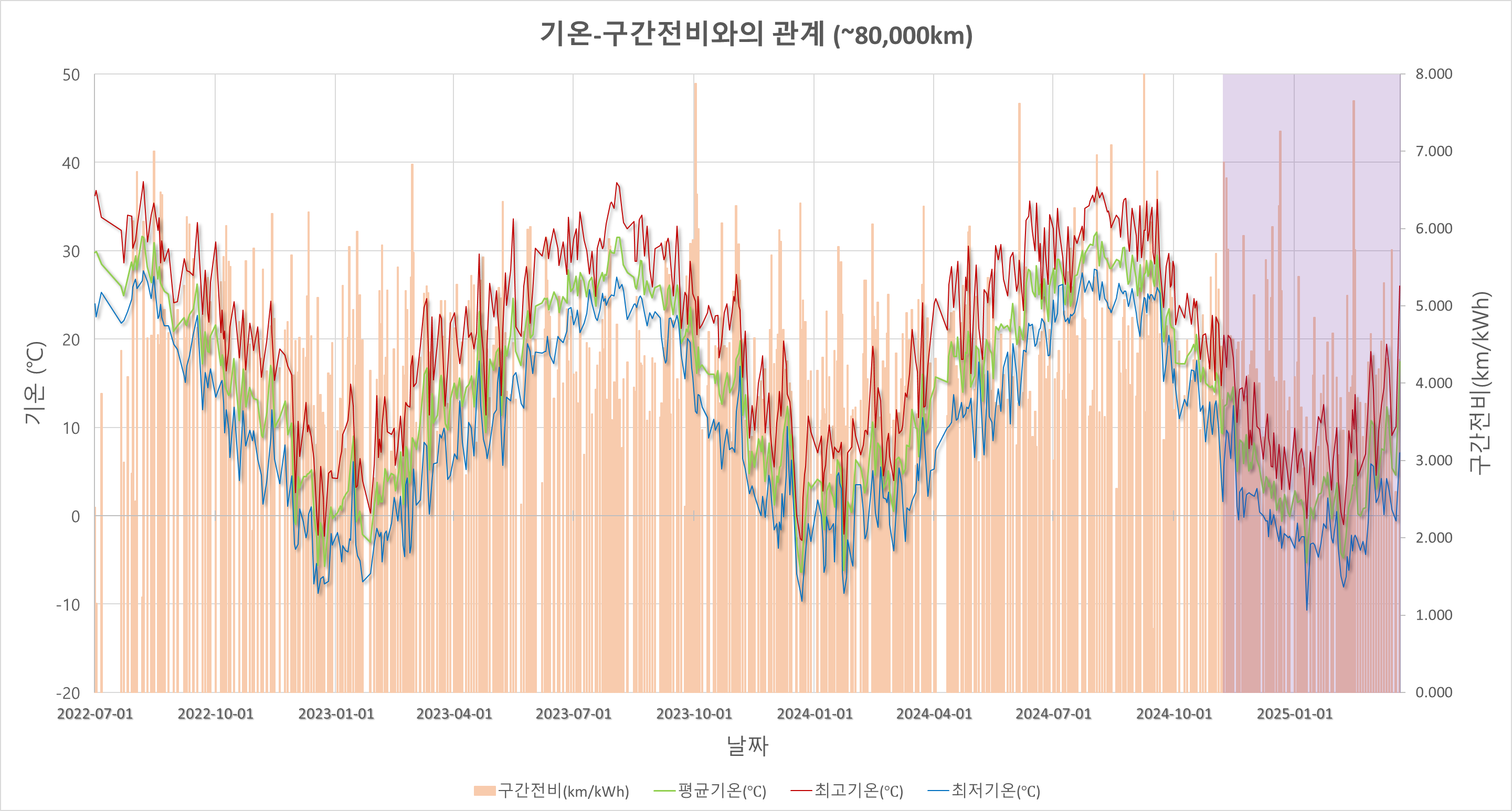 22. 작년보다는 다소 편차는 있었으나 측정구간내 전비 Slope는 좋지 못한거 같음. 중간중간 고전비의 Peak 데이터가 있는데 이때는 겨울임에도 낮기온이 크게 오르고 그에 따라 전비효율이 좋아졌던 날들이 몇 번 있었는데 그 영향으로 생각됨