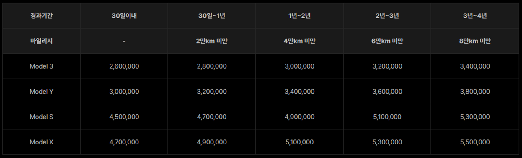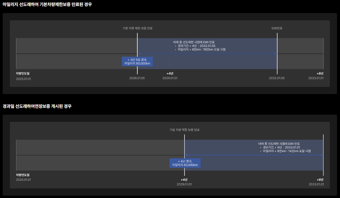 09. EWI는 테슬라 기본 차량 제한보증이 만료되는 날 ( 4년 이내 / 80,000km 선 도래 기준)의 익일부터 4년 혹은 80,000km 중 선 도래하는 시점까지 서비스를 받으실 수 있음