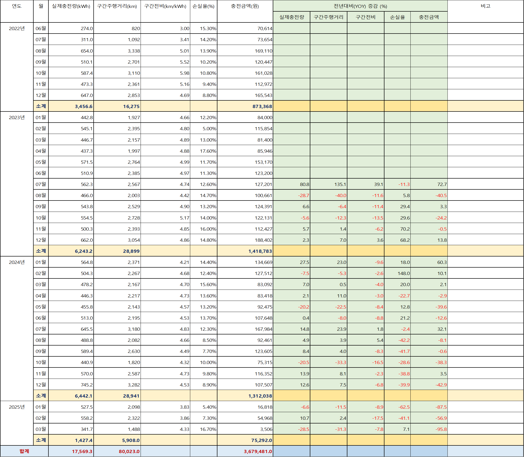 23. 이제는 3년간의 주행기록이 누적되었기 때문에 월별 전비를 비교해봐도 좋을거 같다는 생각임. 다음 사용기에서는 3년간 월별로 전비가 어떻게 바뀌었는지 비교해볼 생각임