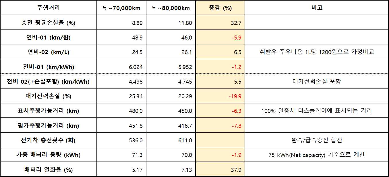01. 충전 평균손실율이 8.89% => 11.80%로 32.7%로 크게 증가함. 이번부터 Tessie 앱을 사용하면서 실시간으로 배터리 열화 정도를 측정할 수 있게 되었는데, 주행거리 66,500km에서부터 이 데이터를 반영하면서 표에서는 충전 평균손실율이 급격하게 높아진 것으로 나타남. (※ 66,500km 이전 데이터는 역산하여 선형으로 배터리가 열화되었다고 가정하였음)