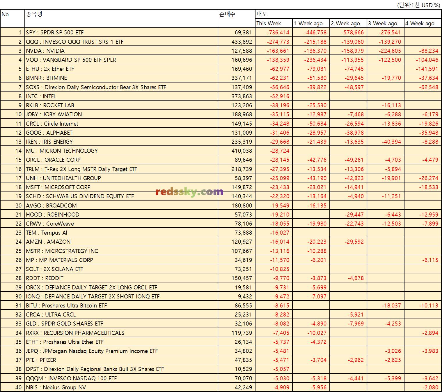 - 지난주 가장 많이 매도한 상위 40 종목 중에서는 SPY > QQQ > NVDA > VOO > ETHU 순으로 큰 매도가 이어졌다.