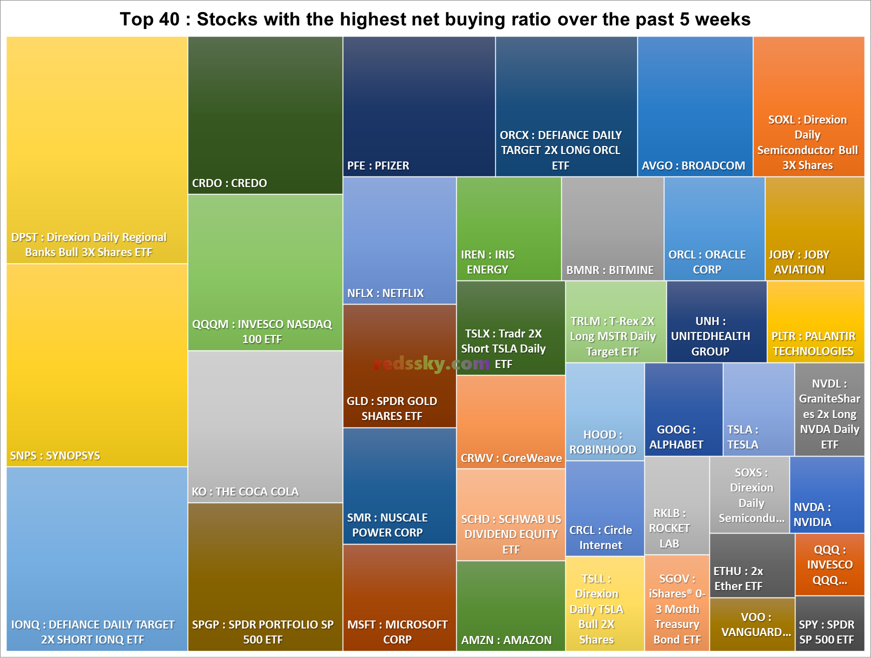 - 상위 40 종목 중 지난 5주동안  NVDA > SOXL > BMNR > PLTR > ORCL 순으로 순매수가 이어졌다.