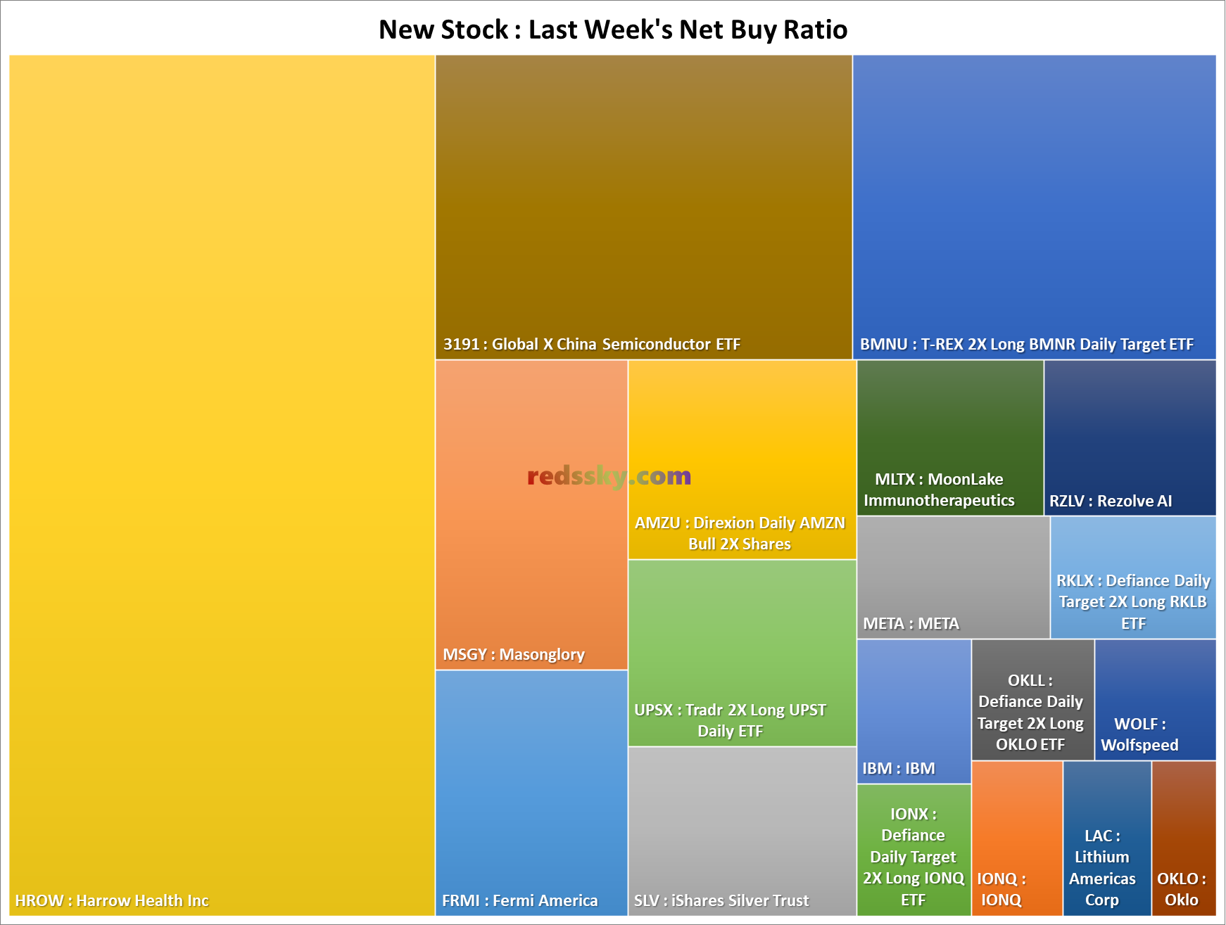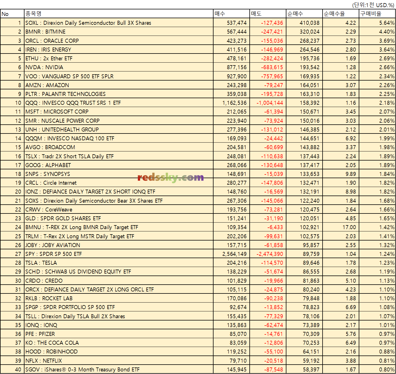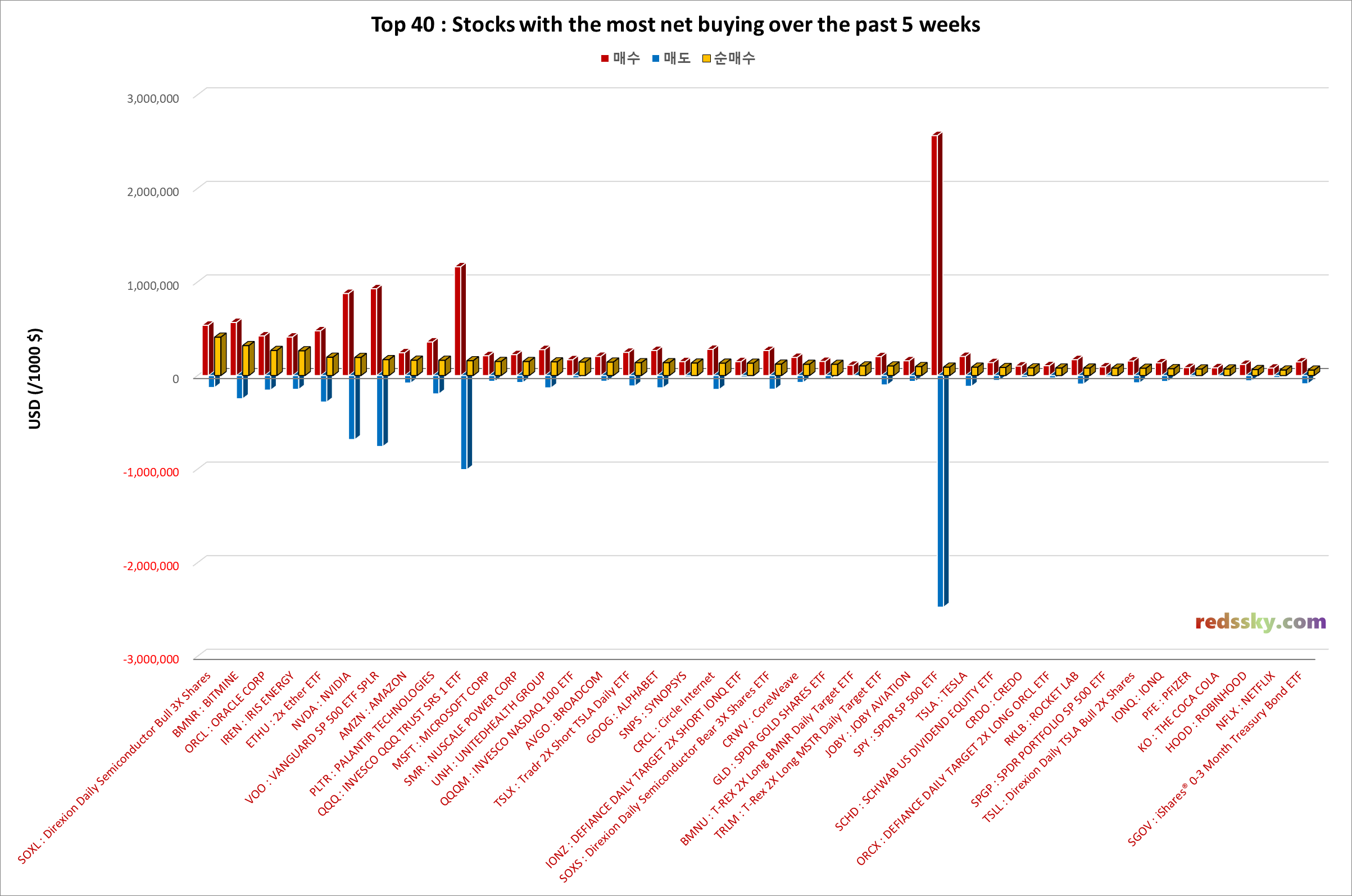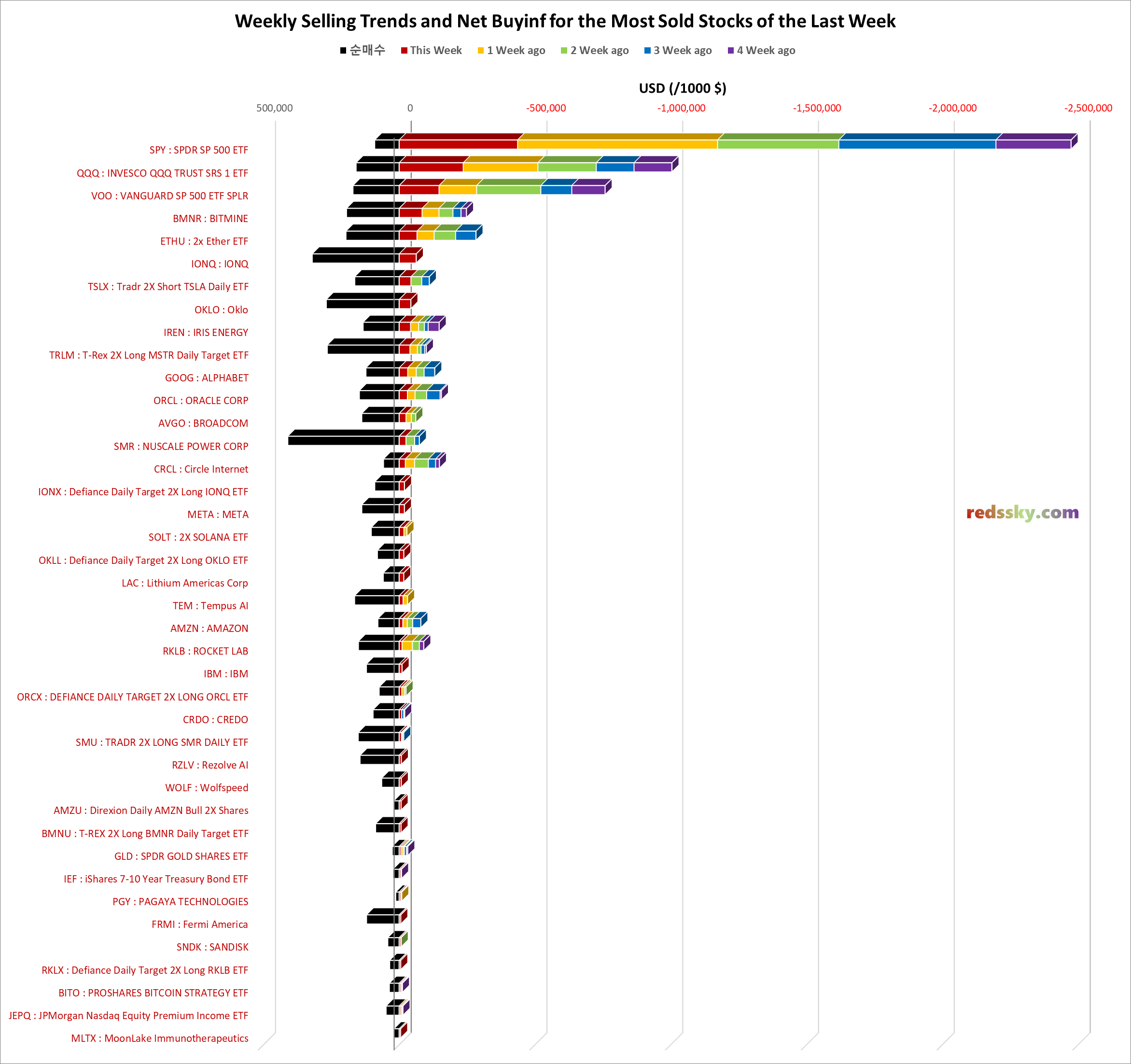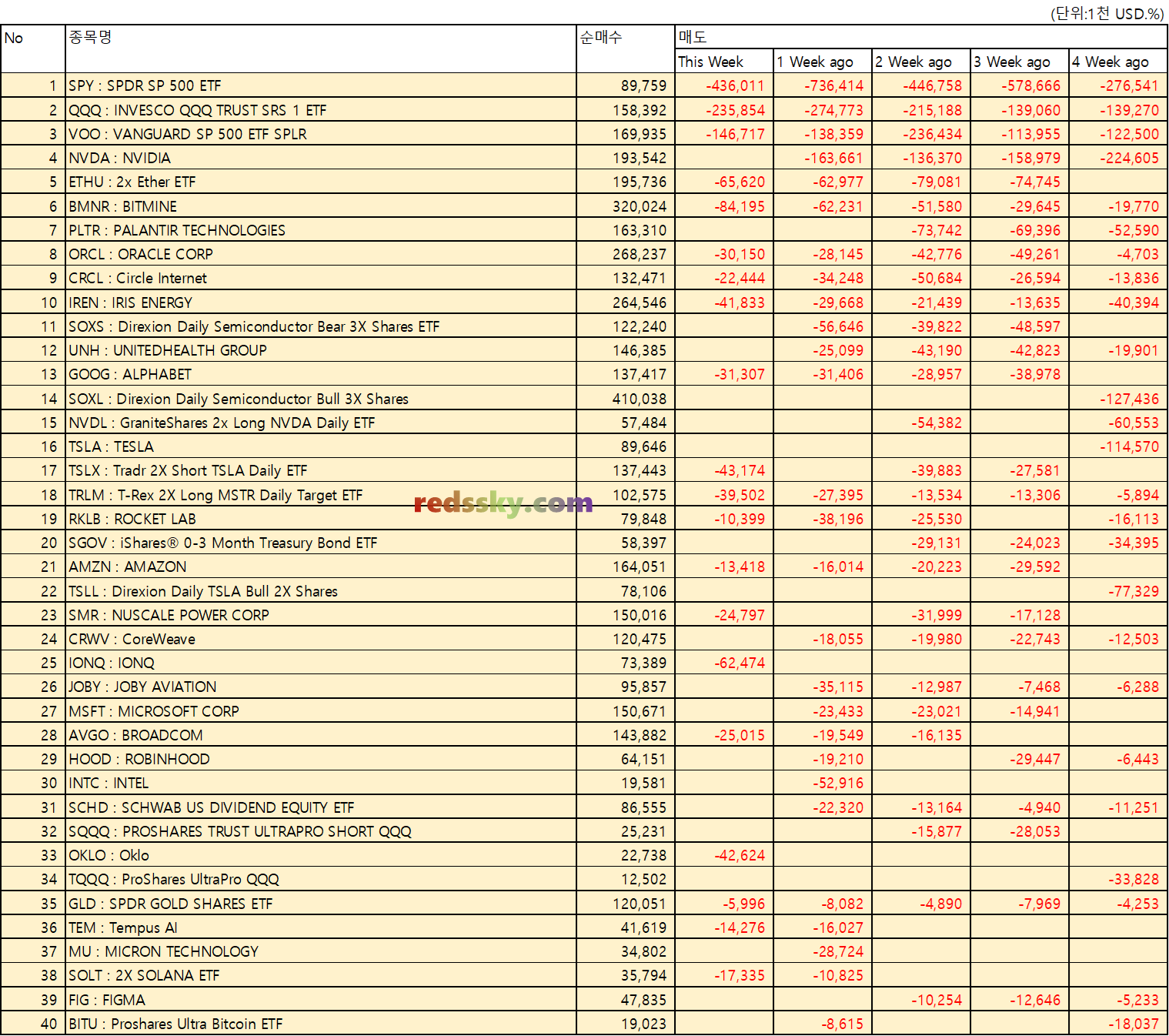 - 지난주 가장 많이 매도한 상위 40 종목 중에서는 SPY > QQQ > VOO > BMNR > ETHU 순으로 매도가 이어졌다.