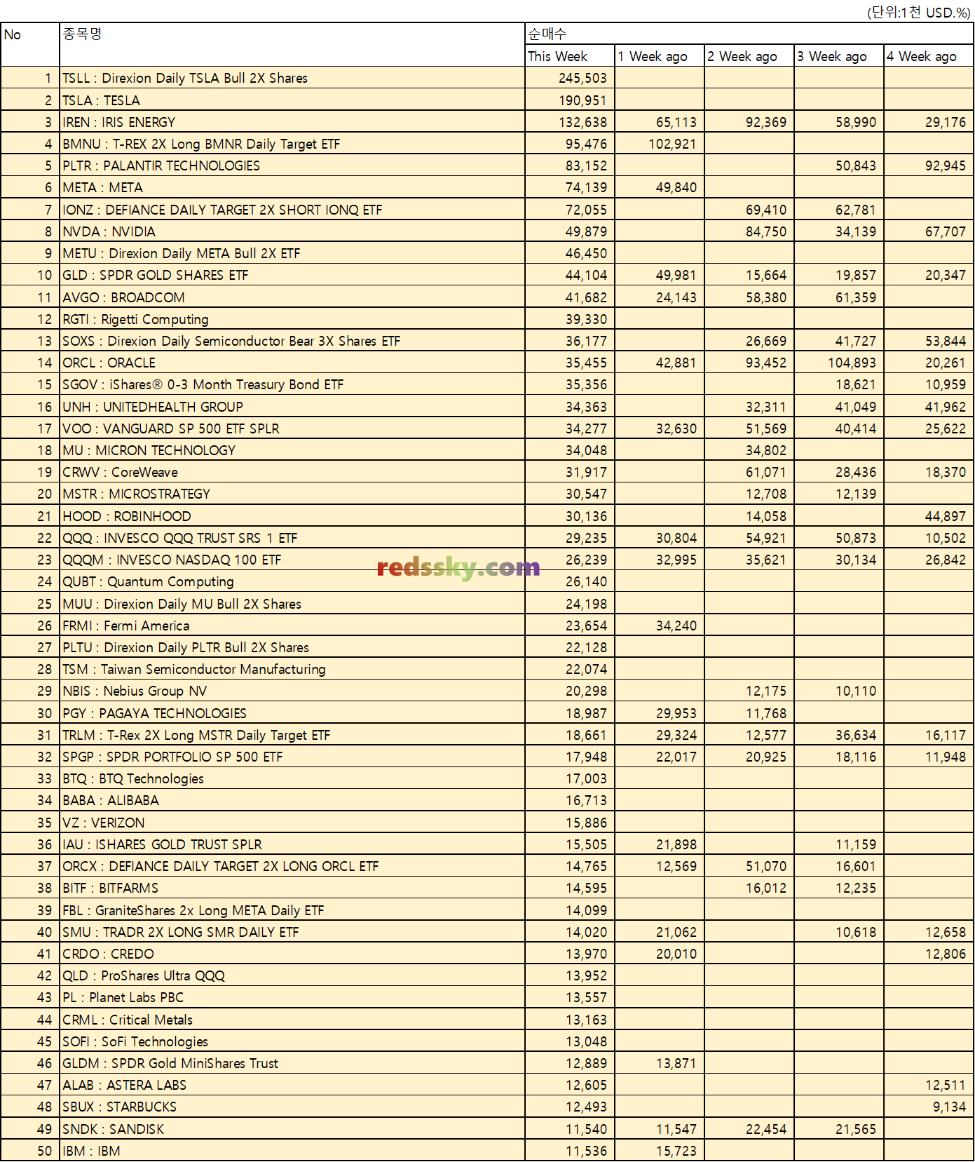 - 상위 40 종목 중 지난 5주동안 IREN > ORCL > BMNR > TSLL > NVDA 순으로 순매수가 이어졌다. IREN, ORCL, BMNR의 매수와 TSLL의 매수 급증이 주목할만 했다.