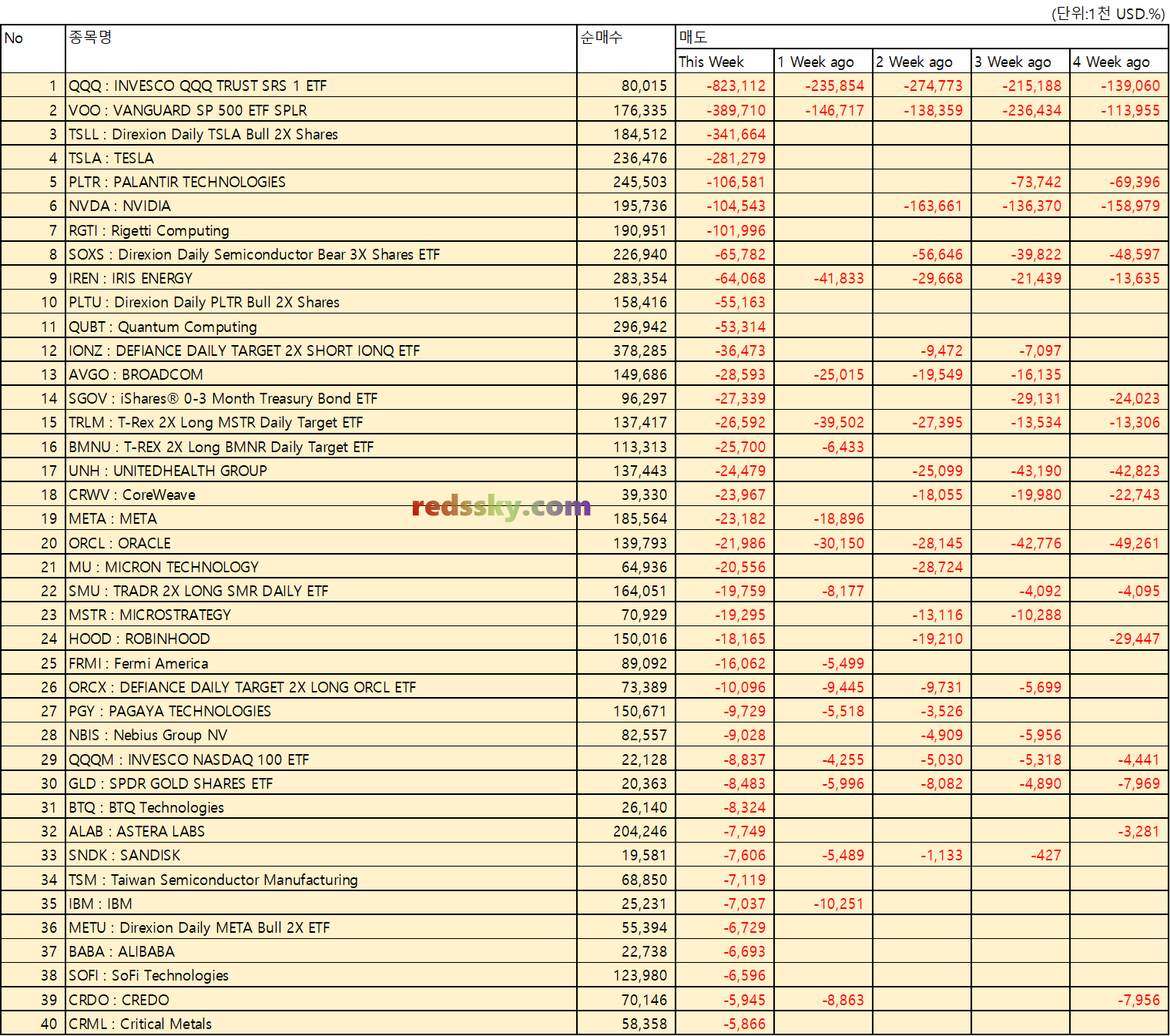 - 지난주 가장 많이 매도한 상위 40 종목 중에서는 QQQ > VOO > TSLL > TSLA > PLTR 순으로 매도가 이어졌다.