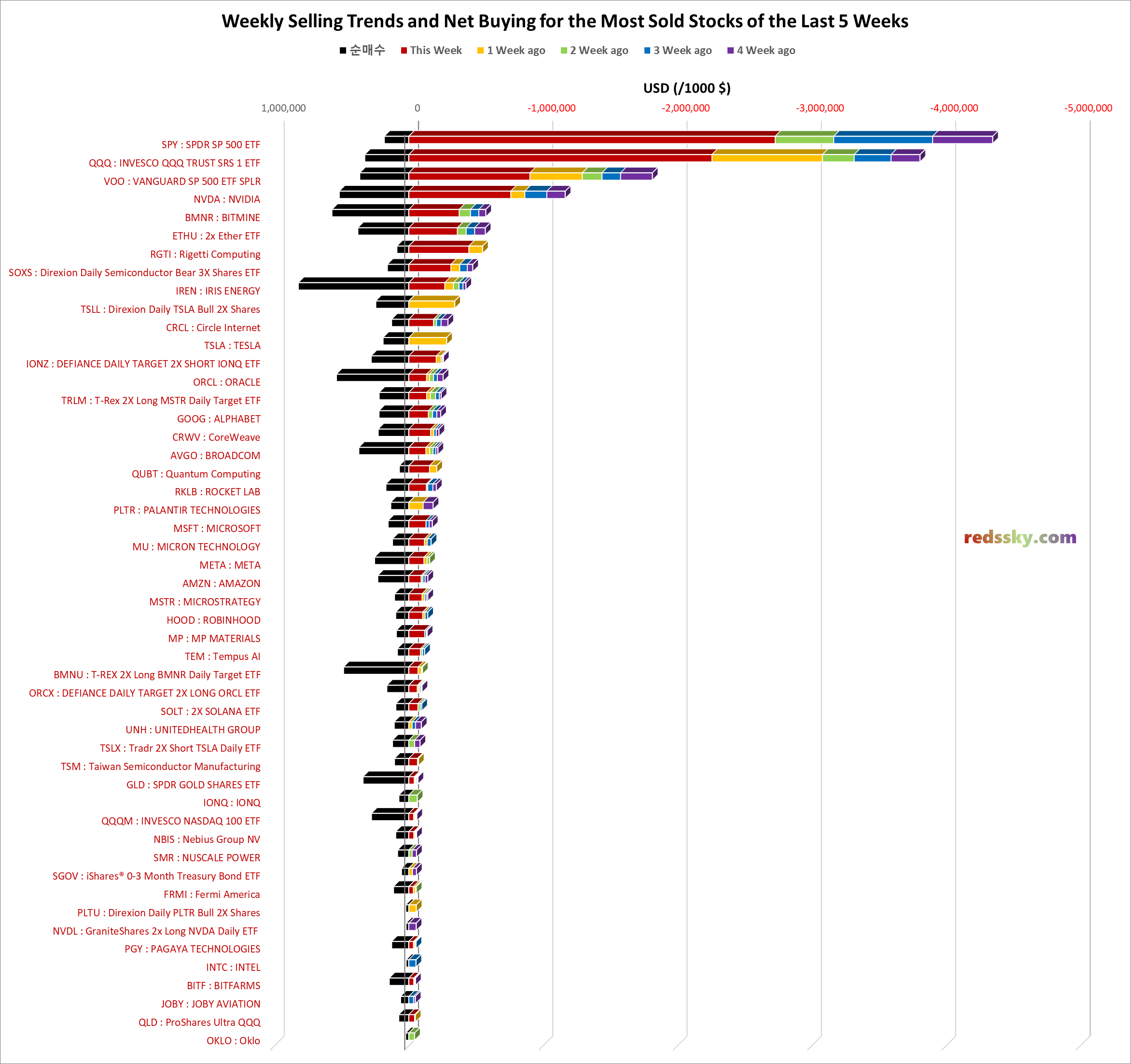 - 상위 40 종목 중 지난 5주동안 SPY > QQQ > VOO > NVDA > BMNR 순으로 매도가 이어졌다.