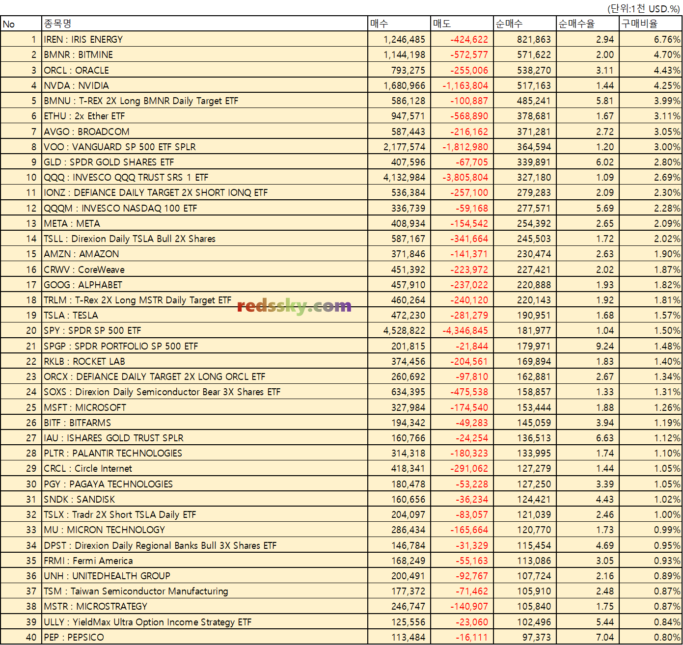 - 상위 40 종목 중 지난주에는 IREN > TSLA > BMNR > BMNU > ORCL 순으로 순매수가 이어졌다.