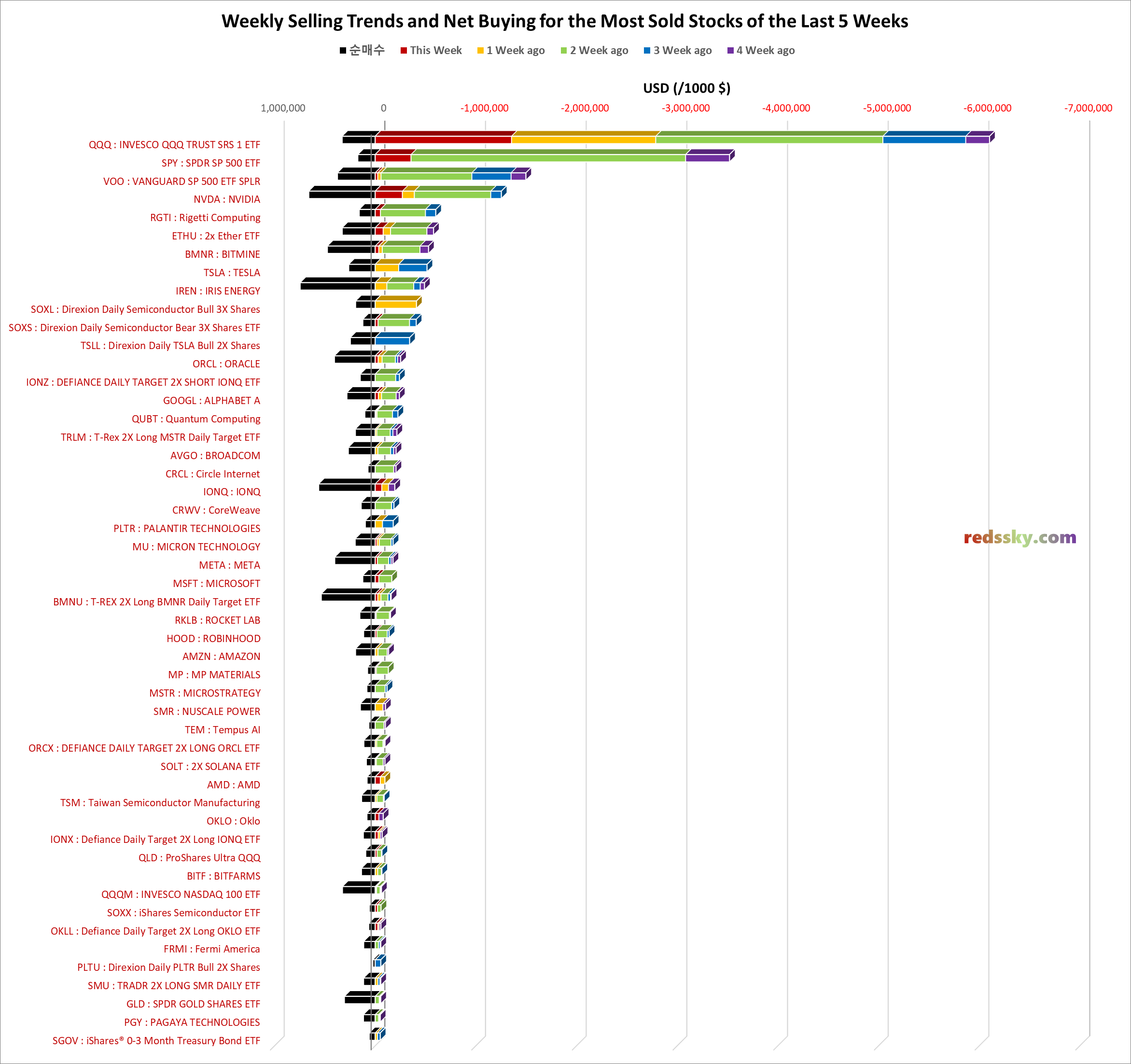 - 상위 40 종목 중 지난 5주동안 QQQ > SPY > VOO > NVDA > RGTI 순으로 매도가 이어졌다.