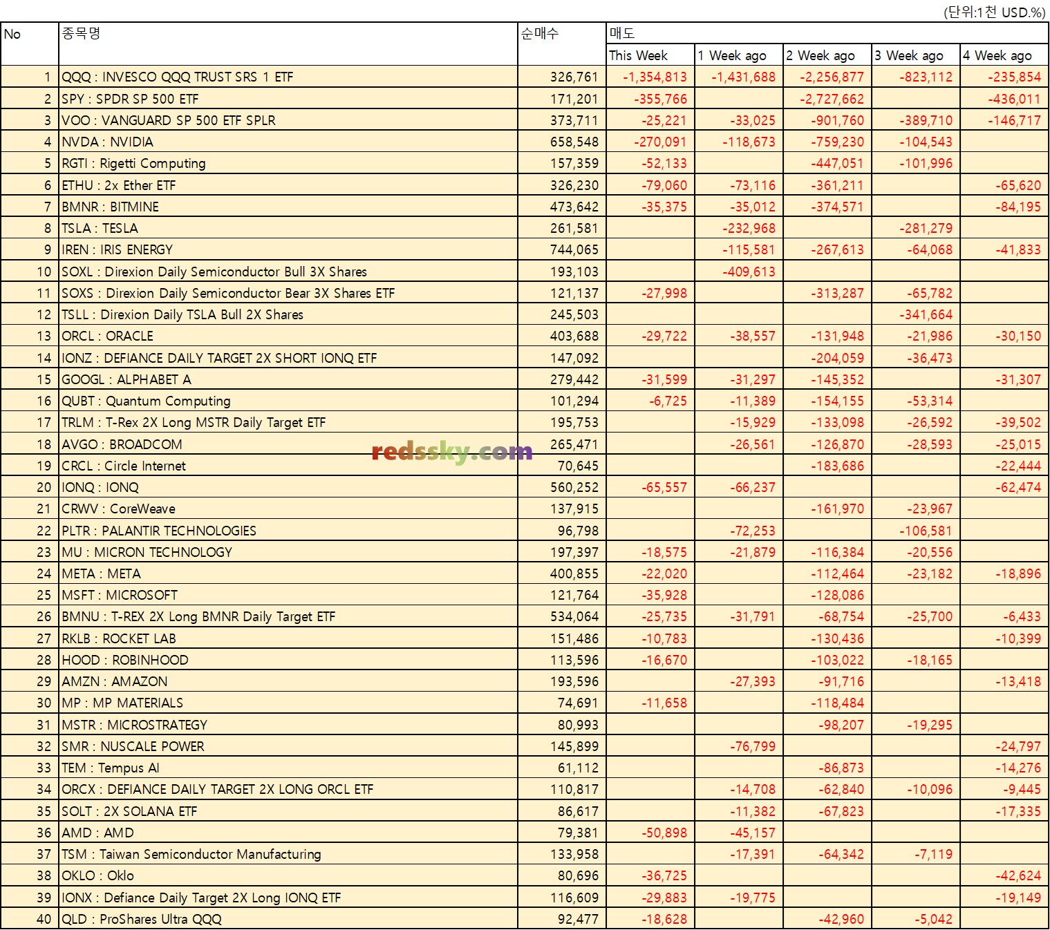 - 지난주 가장 많이 매도한 상위 40 종목 중에서는 QQQ > SPY > NVDA > ETHU > IONQ 순으로 매도가 이어졌다.