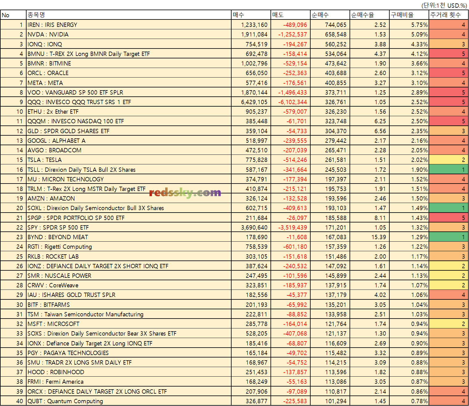 - 상위 40 종목 중 지난 5주동안 IREN > NVDA > IONQ > BMNU > BMNR 순으로 순매수가 이어졌다.