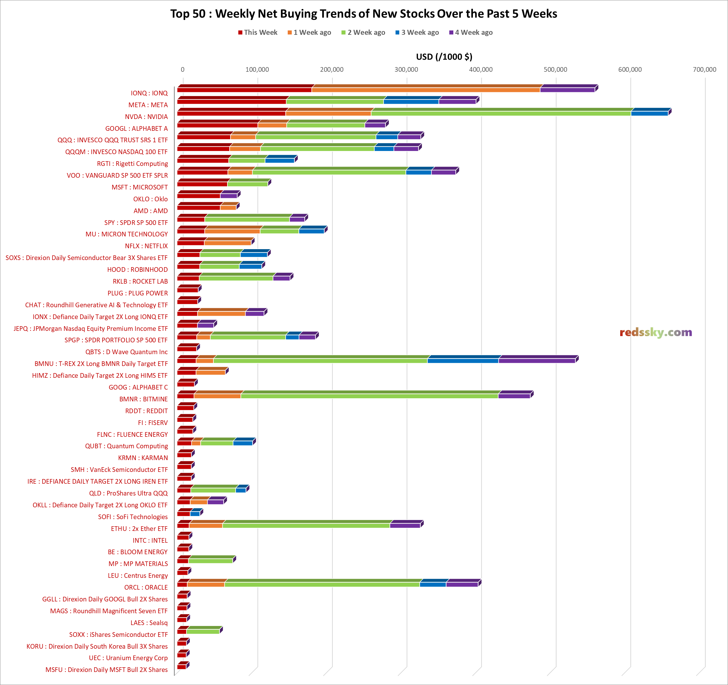 - 상위 50 종목 중 지난주에는 IONQ > META > NVDA > GOOG > QQQ 순으로 순매수가 이어졌다.