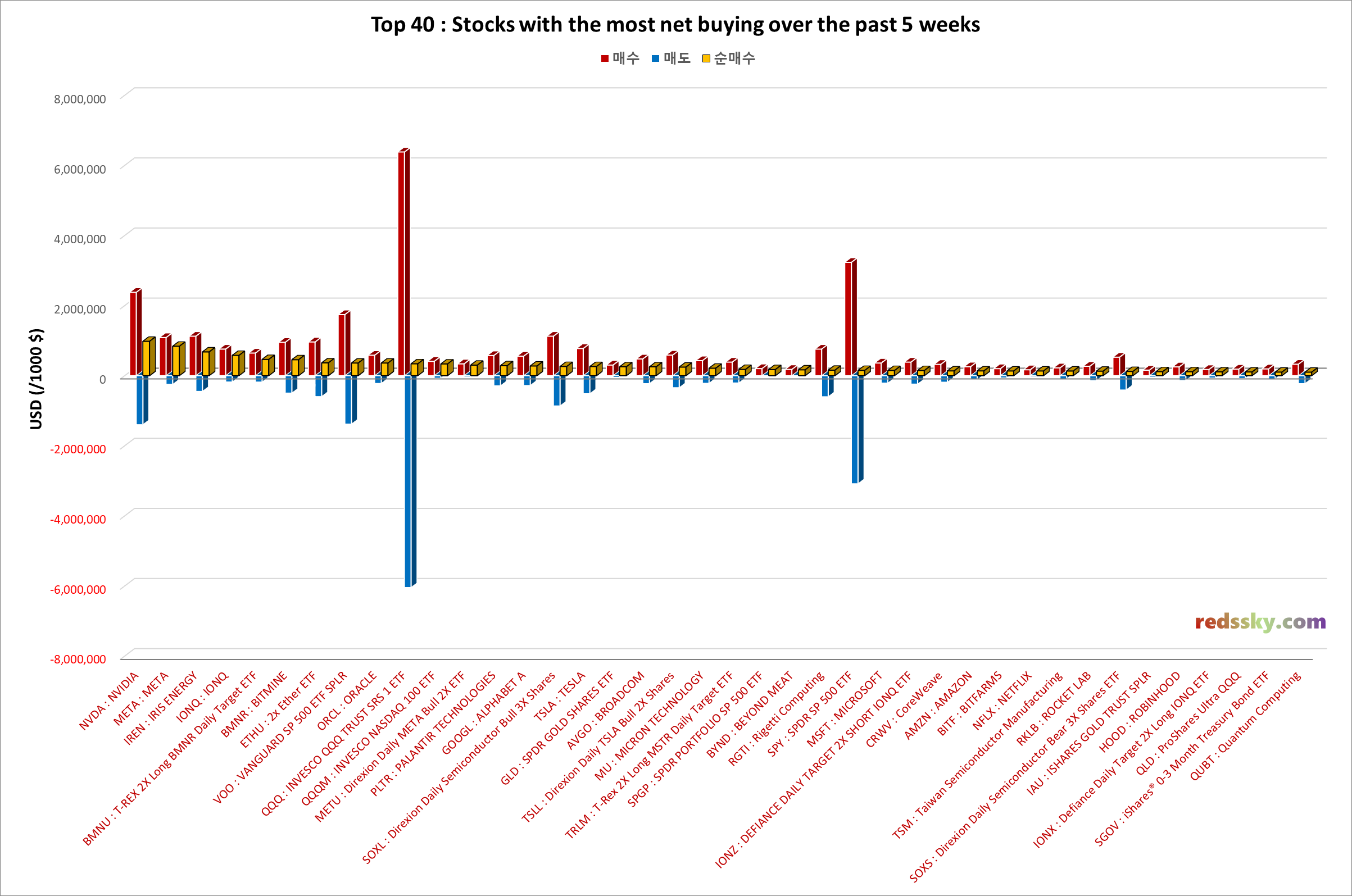 - 상위 40 종목 중 지난 5주동안 NVDA > META > IREN > IONQ > BMNU 순으로 순매수가 이어졌다.