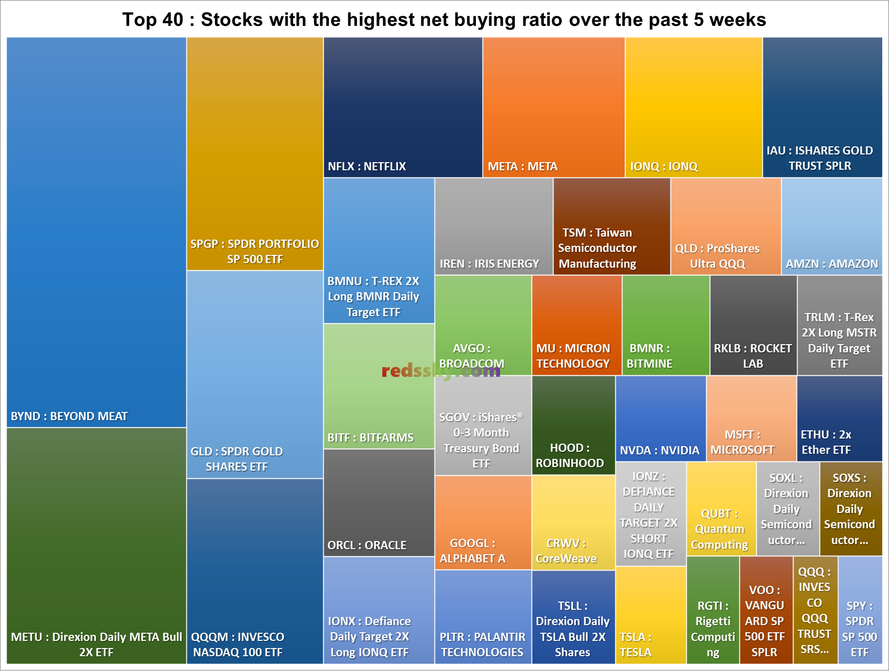 - 상위 40 종목 중 순매수율로 보면 BYND > METU > SPGP > GLD > QQQM 순으로 많았다.
