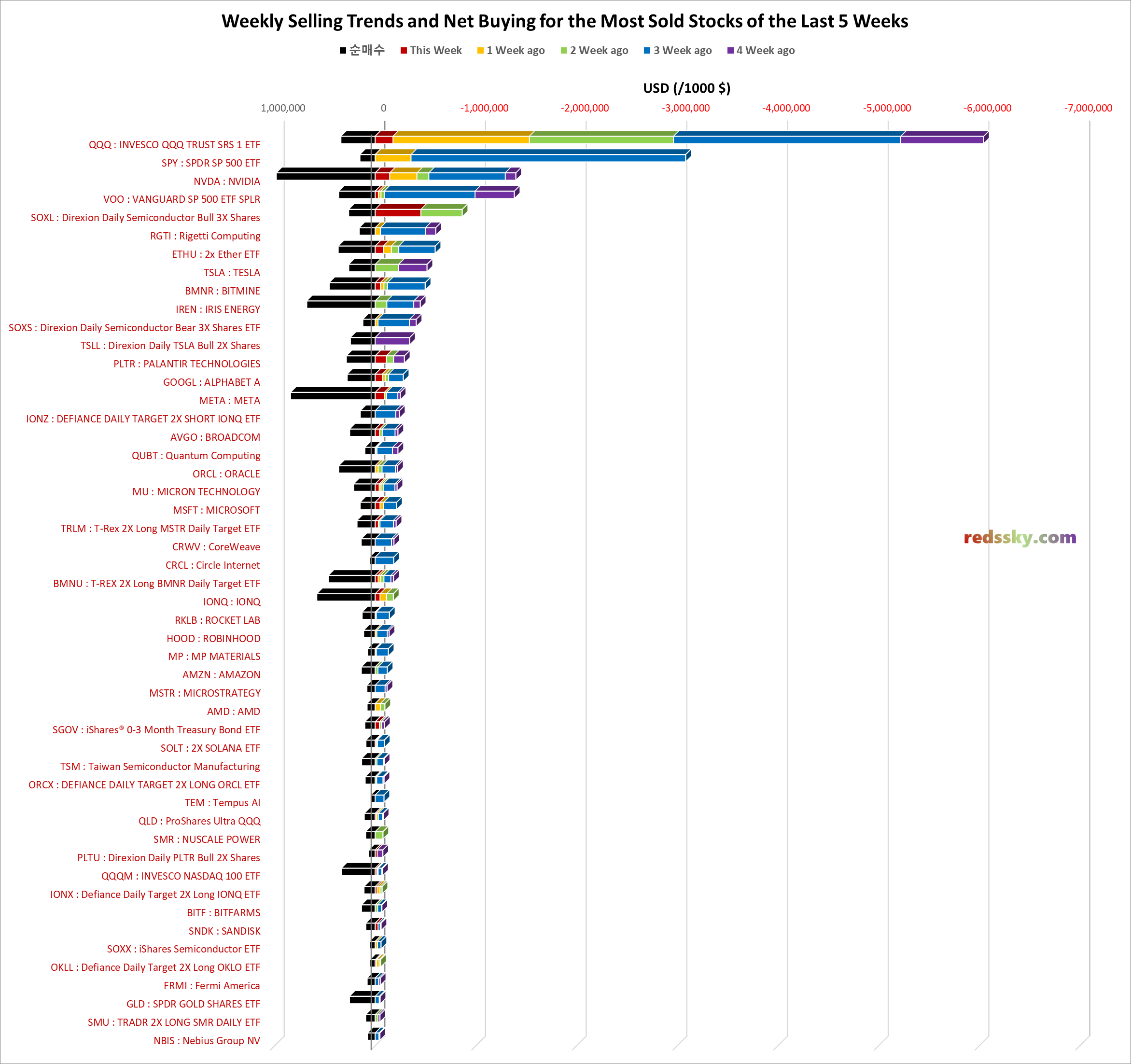 - 상위 40 종목 중 지난 5주동안 QQQ > SPY > NVDA > VOO > SOXL 순으로 매도가 이어졌다.