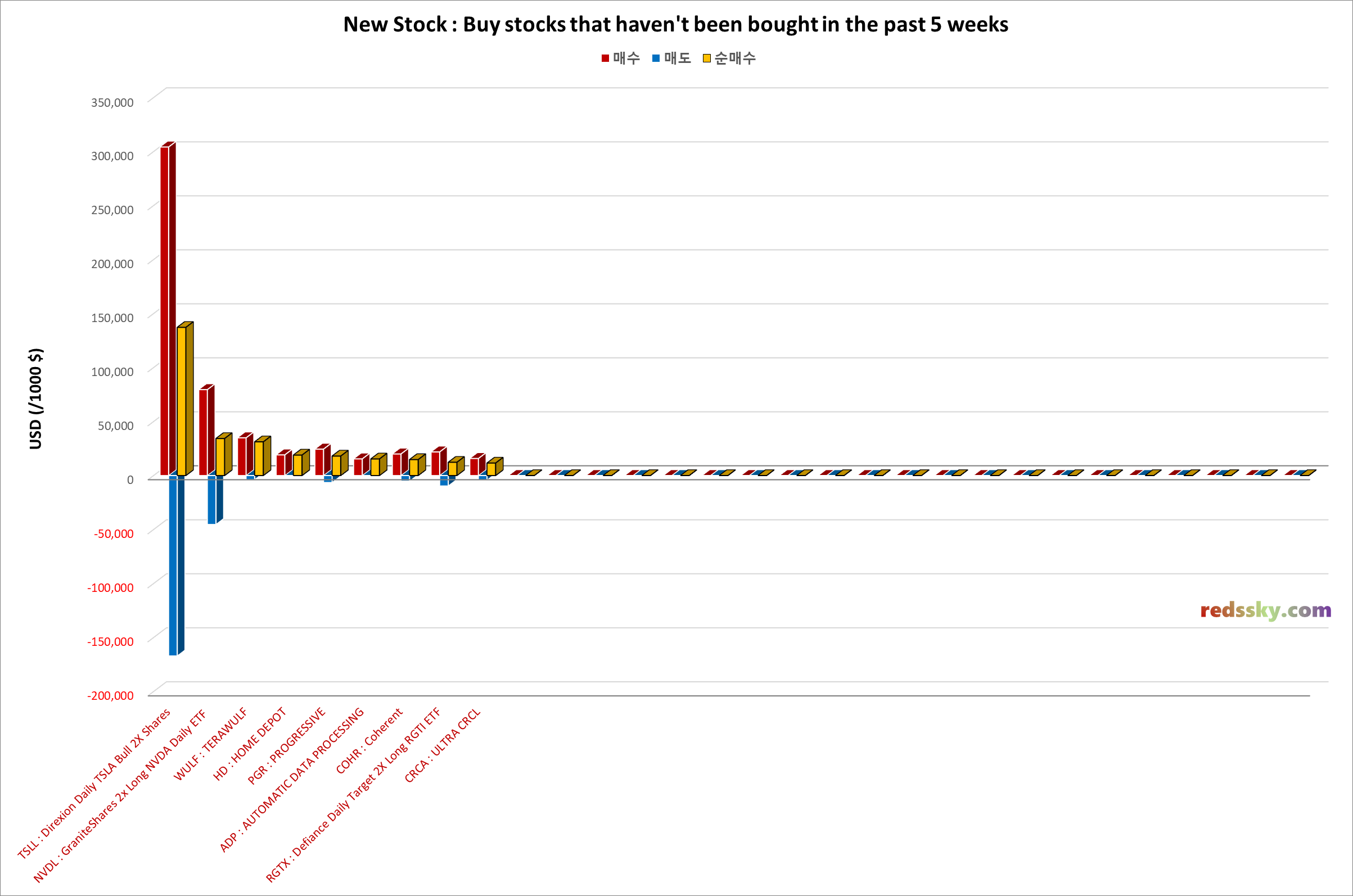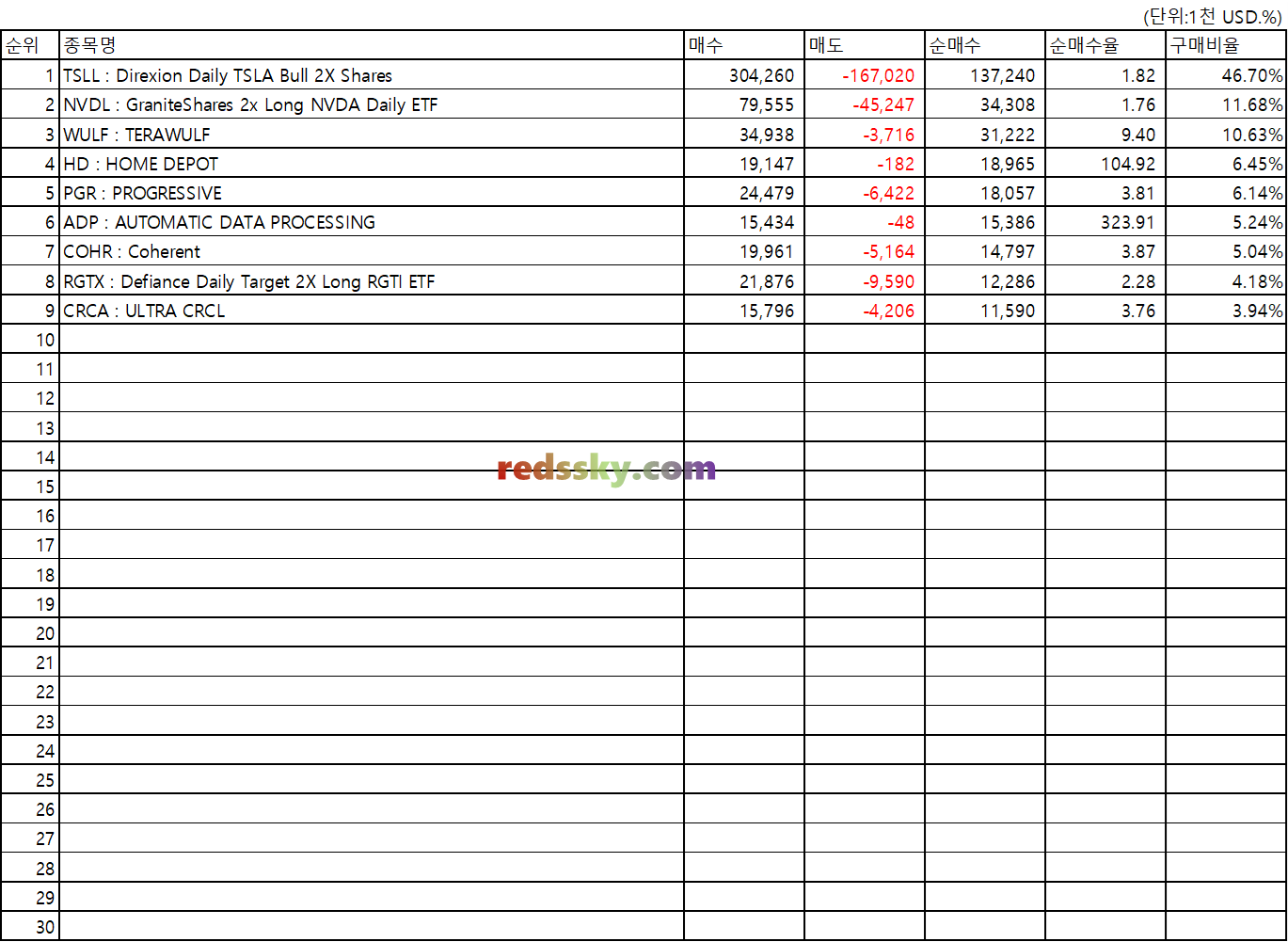 - TSLL > NVDL > WULF > HD > PGR 순으로 순매수 되었다.