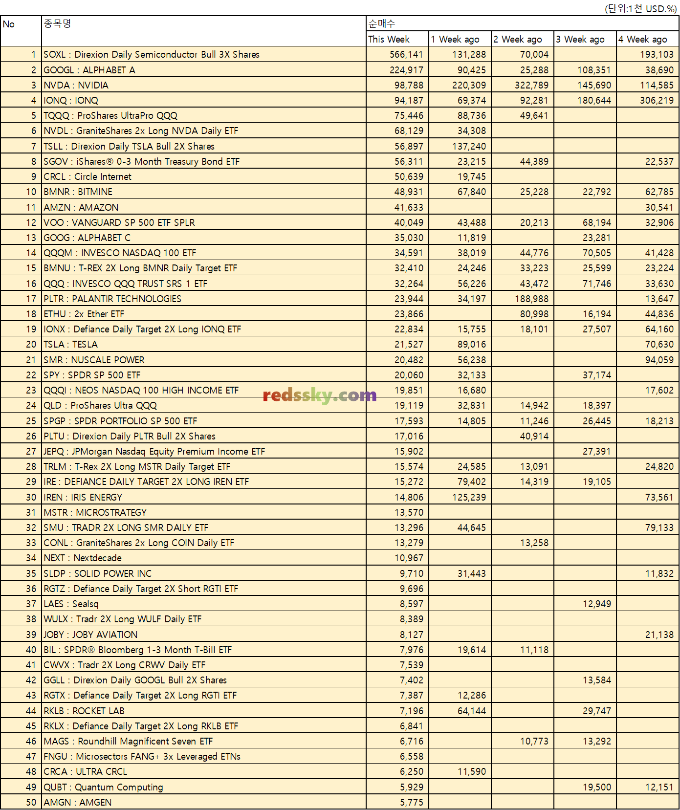 - 지난주에는 상위 50 종목 중 지난주에는 SOXL > GOOGL > NVDA > IONQ > TQQQ 순으로 순매수가 많았다.