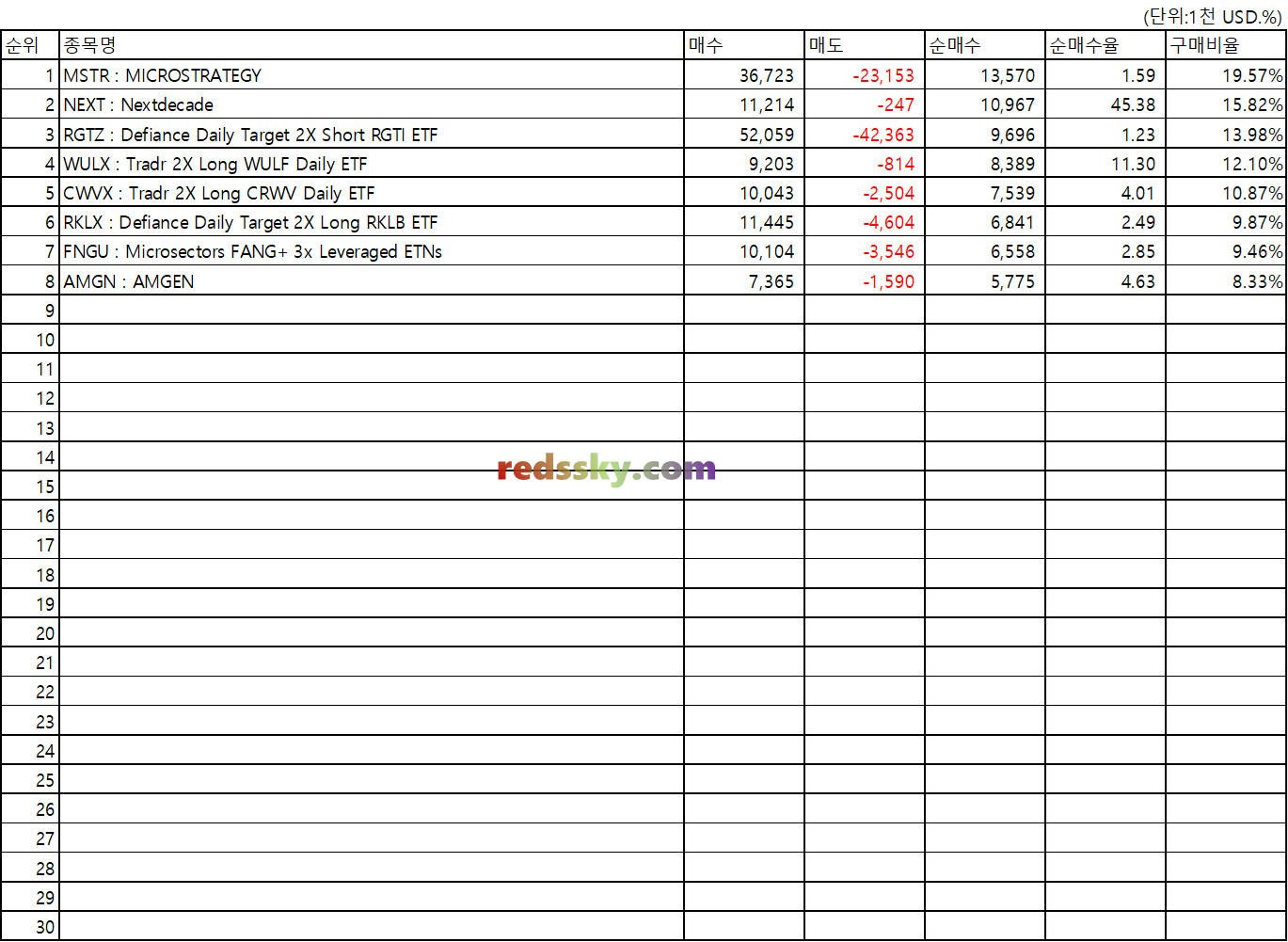 - MSTR > NEXT > RGTZ > WULX > CWVX 순으로 순매수 되었다.