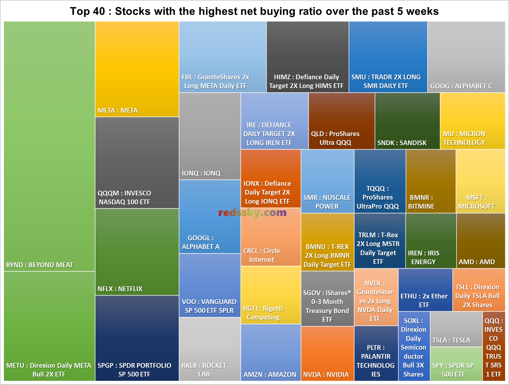 - 상위 40 종목 중 지난 5주동안 순매수율은 BYND > METU > META > QQQM > NFLX 순으로 기록했다.