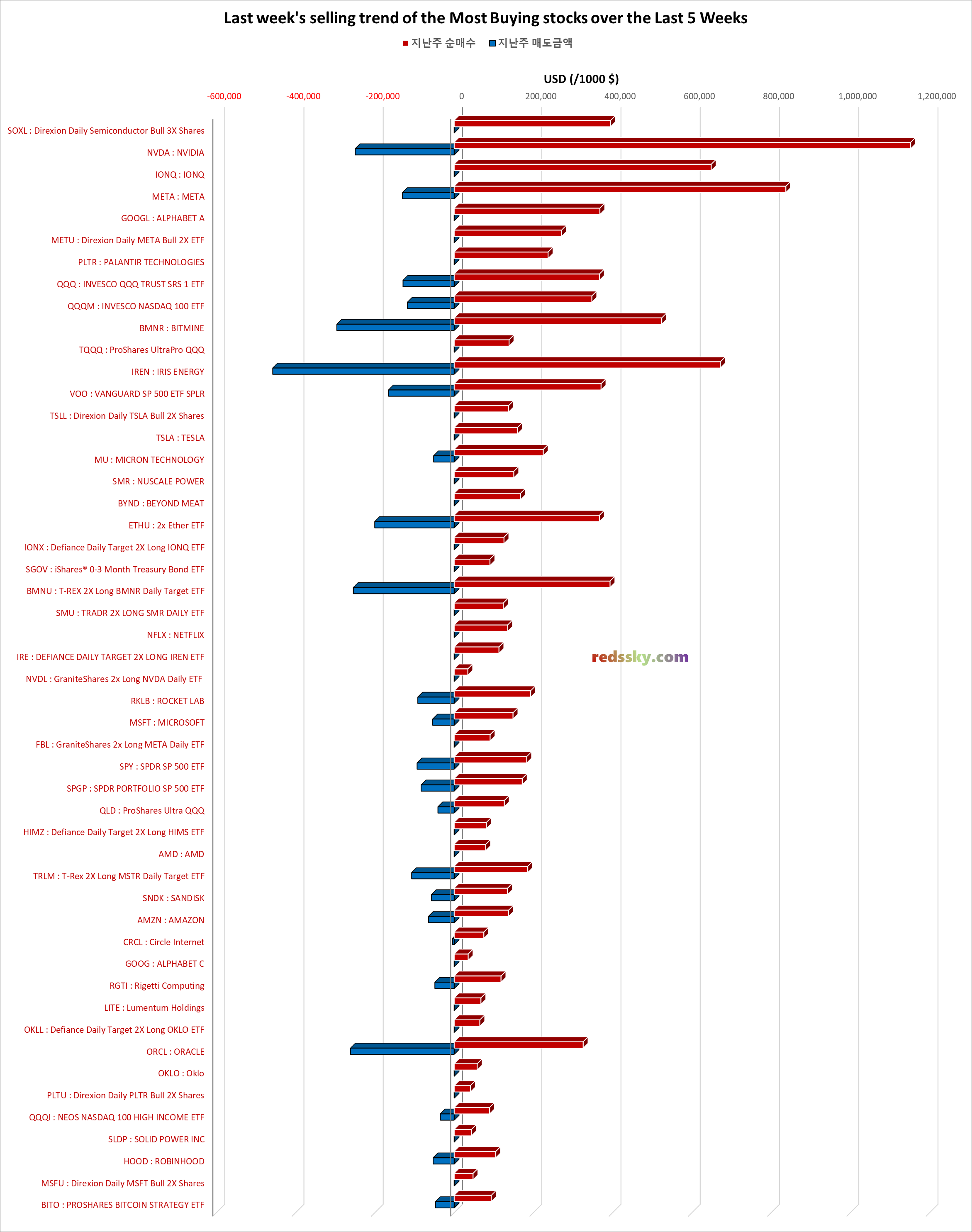 - 지난주 대비해서 NVDA, META, BMNR, IREN의 매도비율 눈에 뛴다.