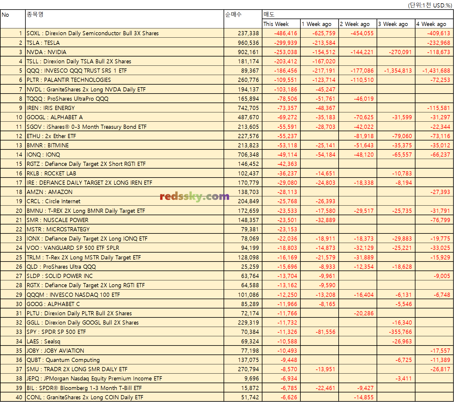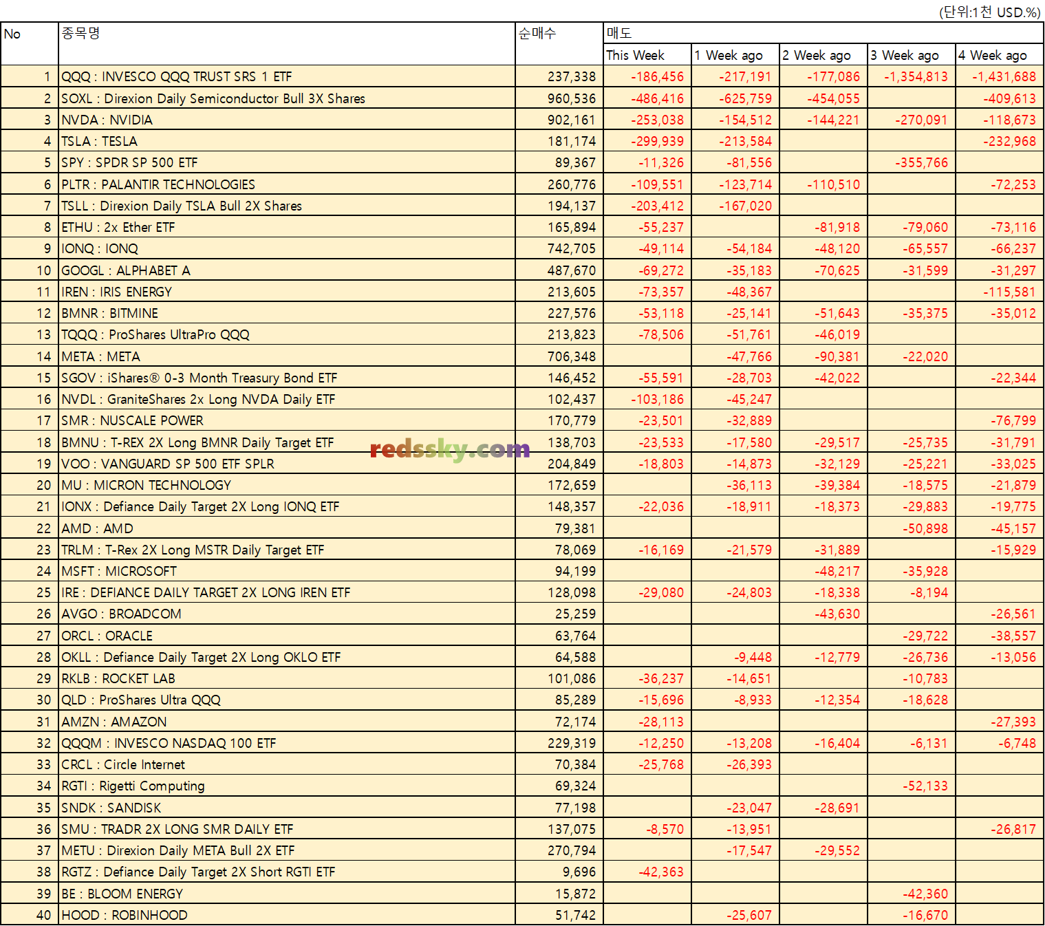 - 지난 5주간 상위 40 종목 중 QQQ > SOXL > NVDA > TSLA > SPY 순으로 매도규모가 많았다.