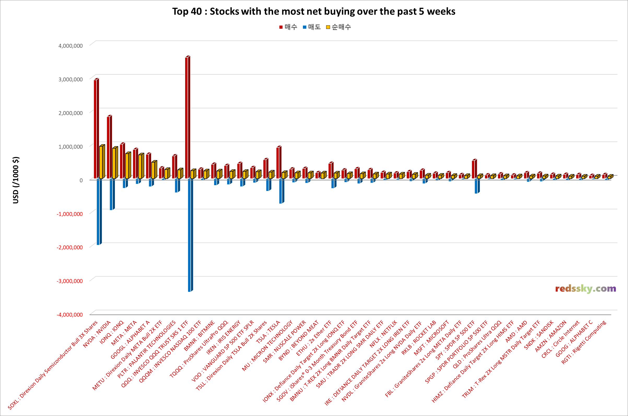- 상위 40 종목 중 지난 5주동안 SOXL > NVDA > IONQ > META > GOOGL 순으로 순매수되었다.