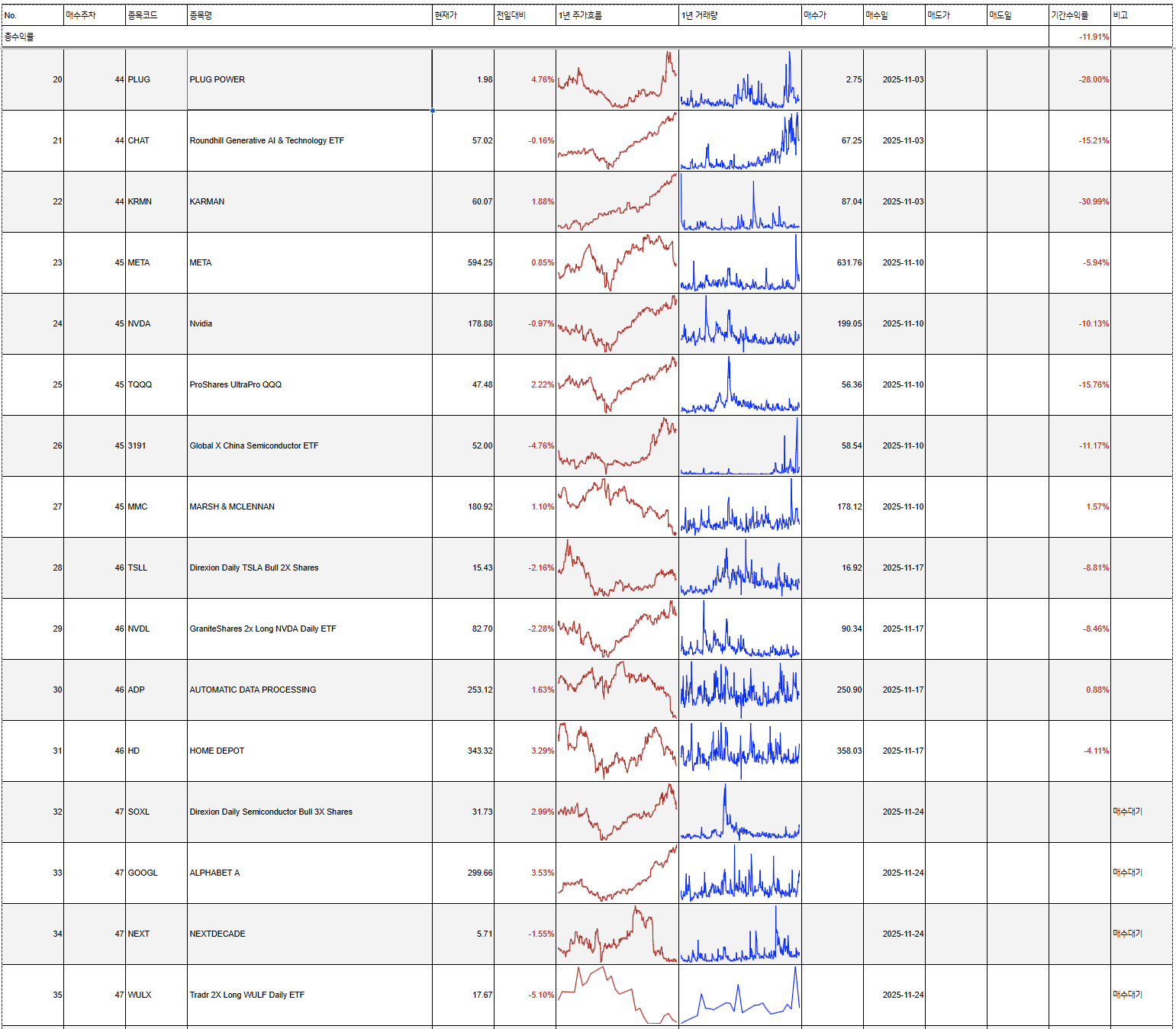 - 2025년 11월 21일 (금) 종가기준으로 기간내 총수익률은 이전 주 -10.37 % > -11.91 % 로 변경되었다.