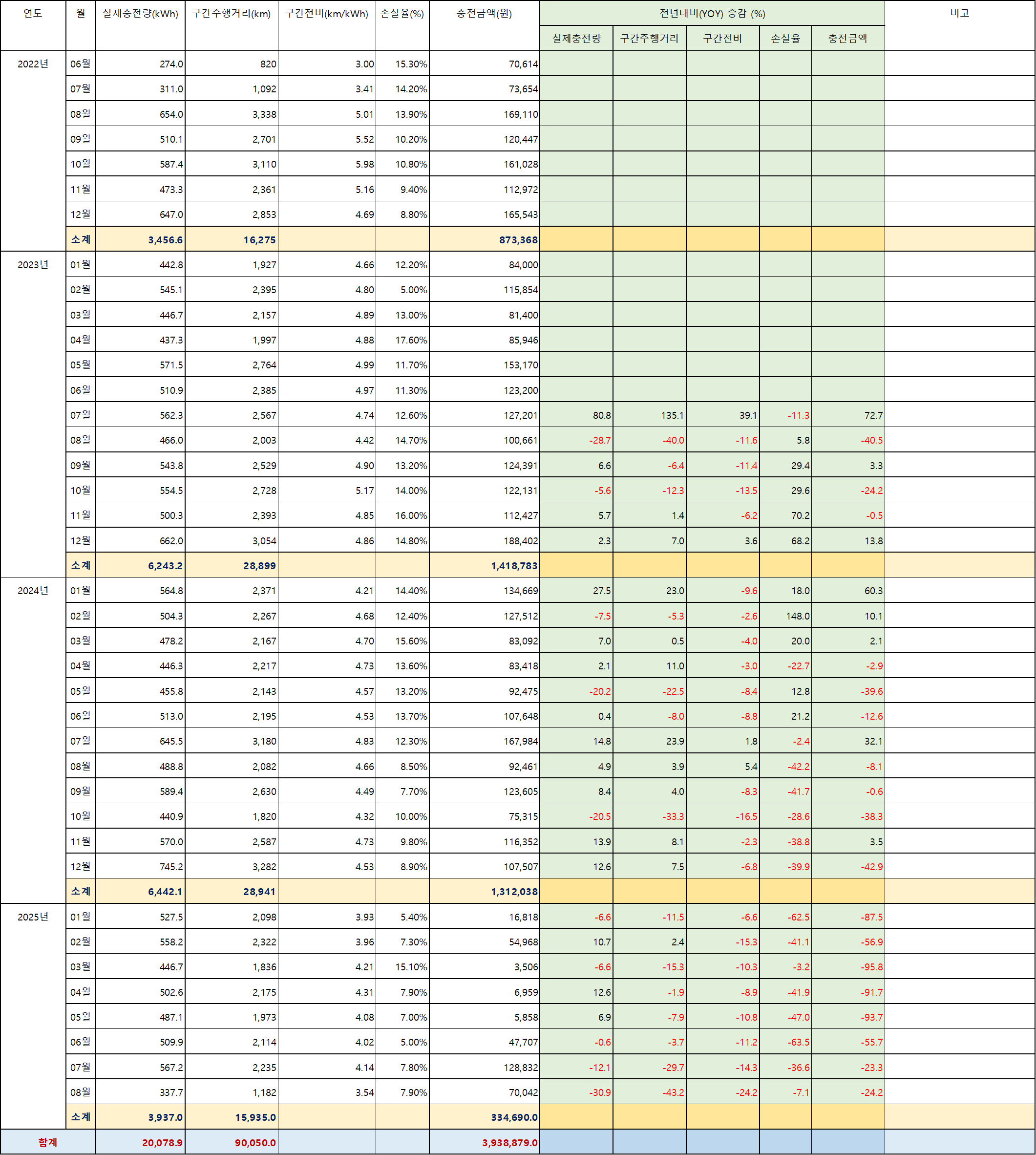 11. 2024년에서 2025년으로 넘어오면서 YOY간 비교해보면, 배터리 효율이 크게 저하된 것으로 나타남. 충전량과 주행거리의 차이로 인해 YOY 비교가 어렵지만 구간전비를 기준한다면 확실히 10% 정도의 효율저하가 일어난 것으로 보임. 특히 7,8월 여름철의 효율저하가 매우 컸음