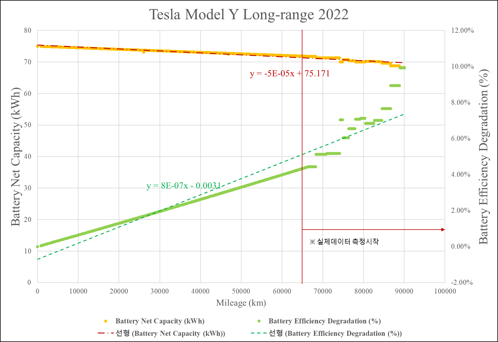 19. 실제데이터 측정은 약 65,000 km 에서 시작하였음. 이전 ~65,000 km 까지의 데이터는 누적주행거리 65,000 km 를 기준으로 열화율을 역산하여 선형으로 계산한 것임.