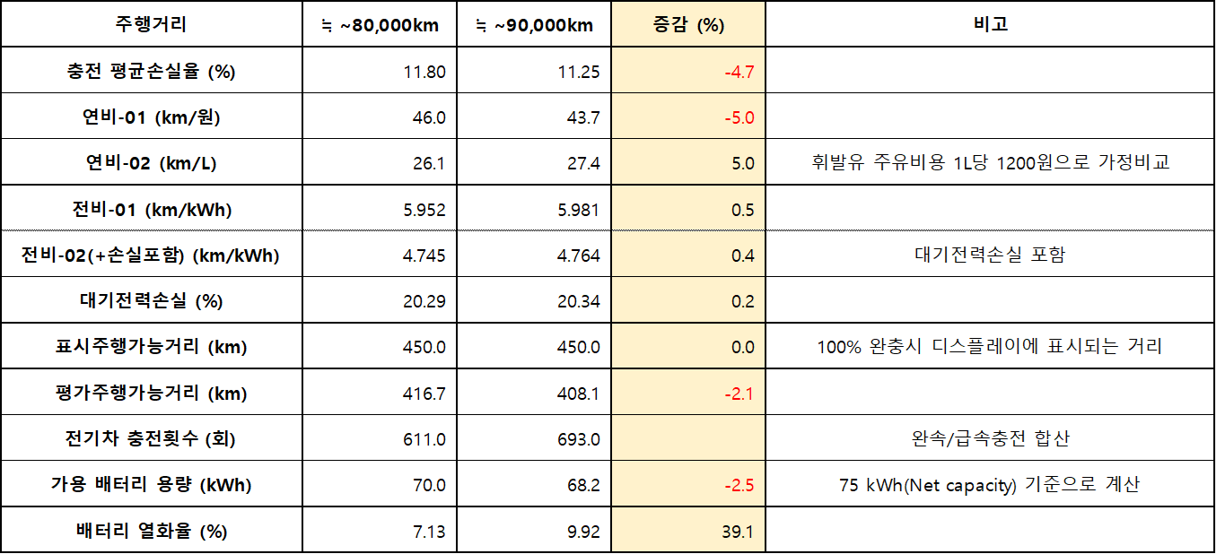 06. 그러나 배터리 열화는 7.13% => 9.92%로 39.1% 로 크게 나빠져 가용 배터리 용량이 70.0 => 68.2 kWh로 2.5 % 감소함