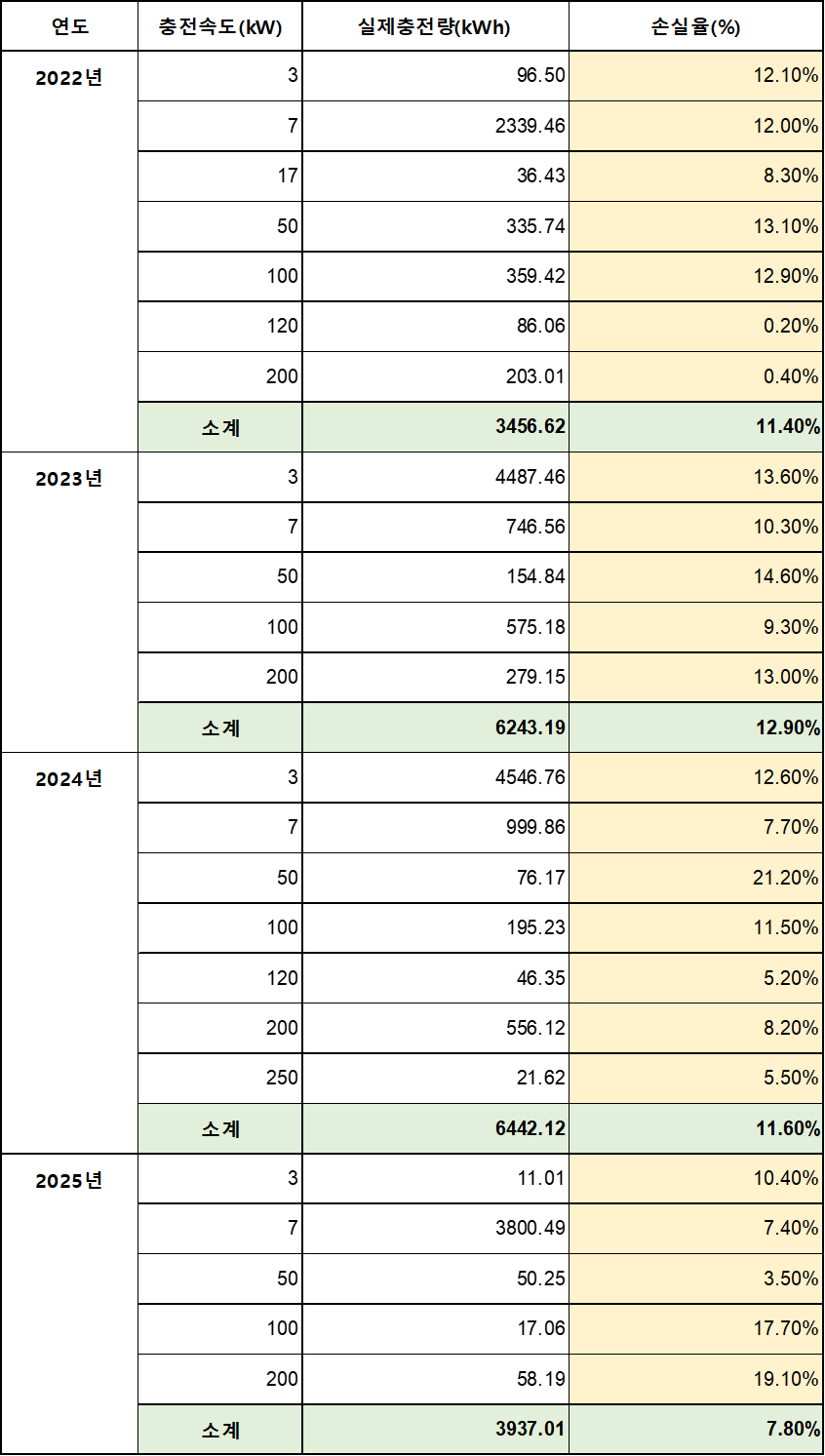 14. 2025년 충전속도별 충전손실율을 비교해 본다면 완속에서는 7kWh, 급속에서는 50kWh급에서 가장 효율이 좋았음.