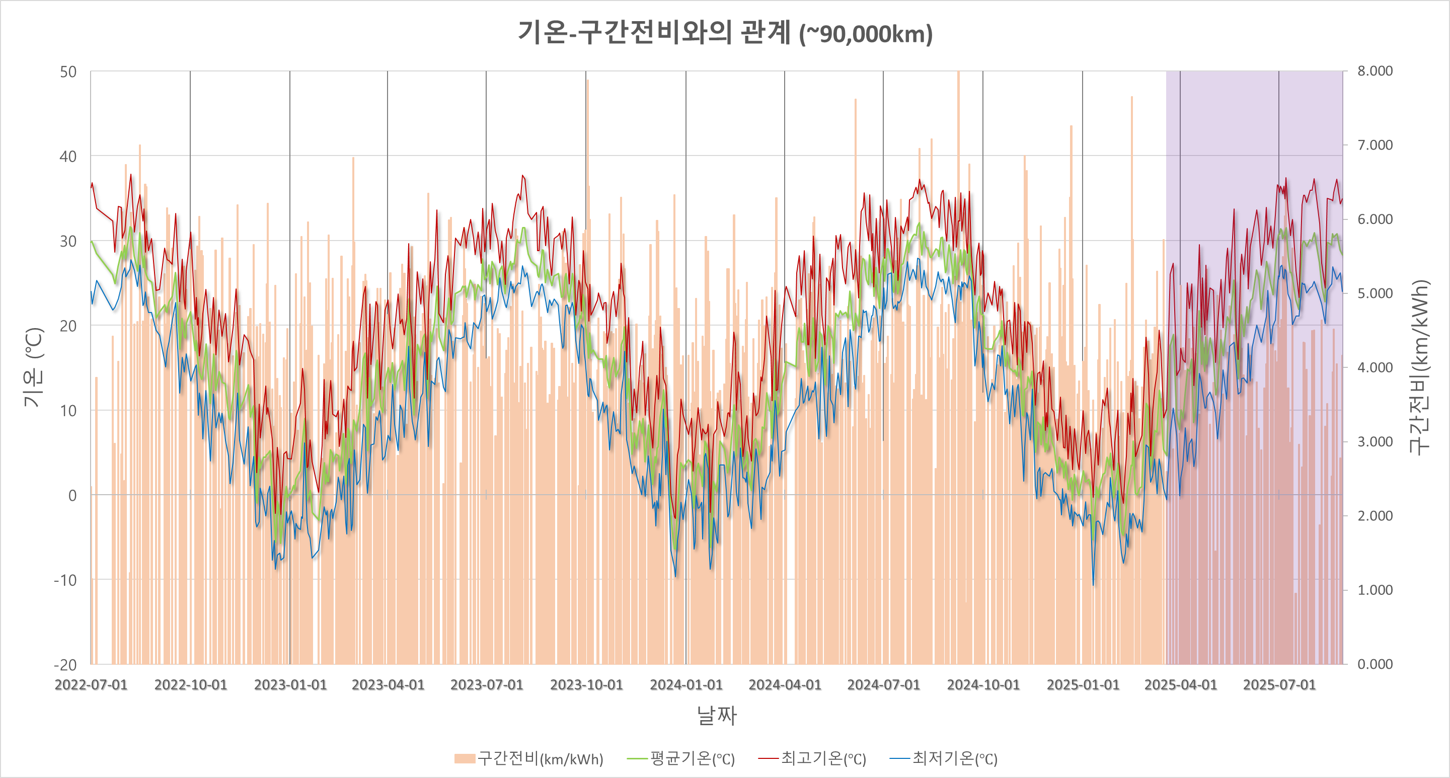 18. 일별 구간전비 기록의 크기빈도만 봐도 2025년 에너지 효율저하가 확인됨. 좀 개선할 방법이 있을지 모르겠음