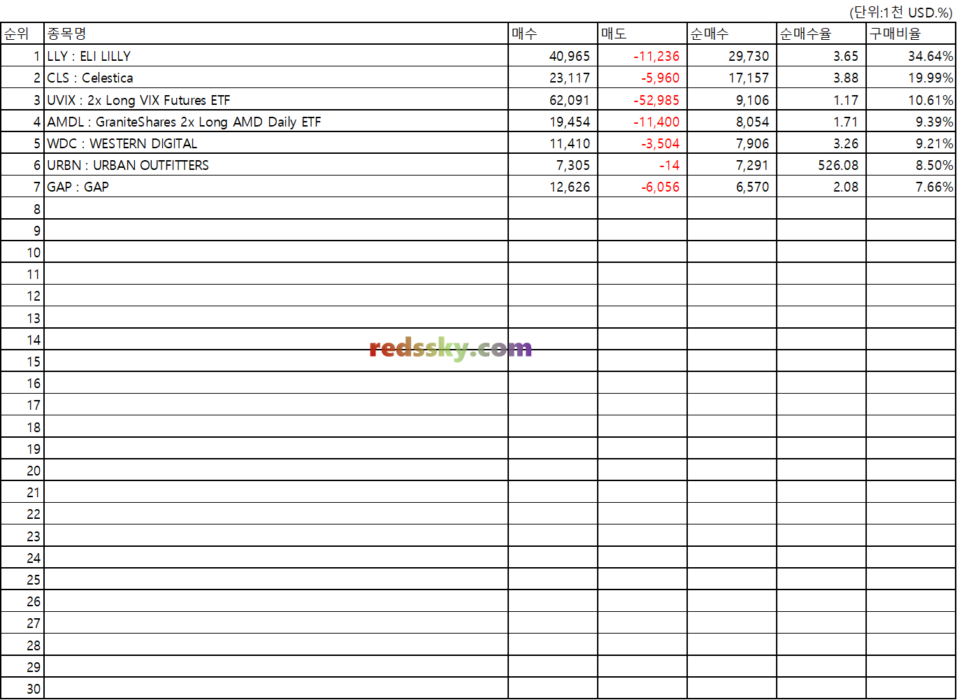 - LLY > CLS > UVIX > AMDL > WDC 순으로 순매수 되었다.