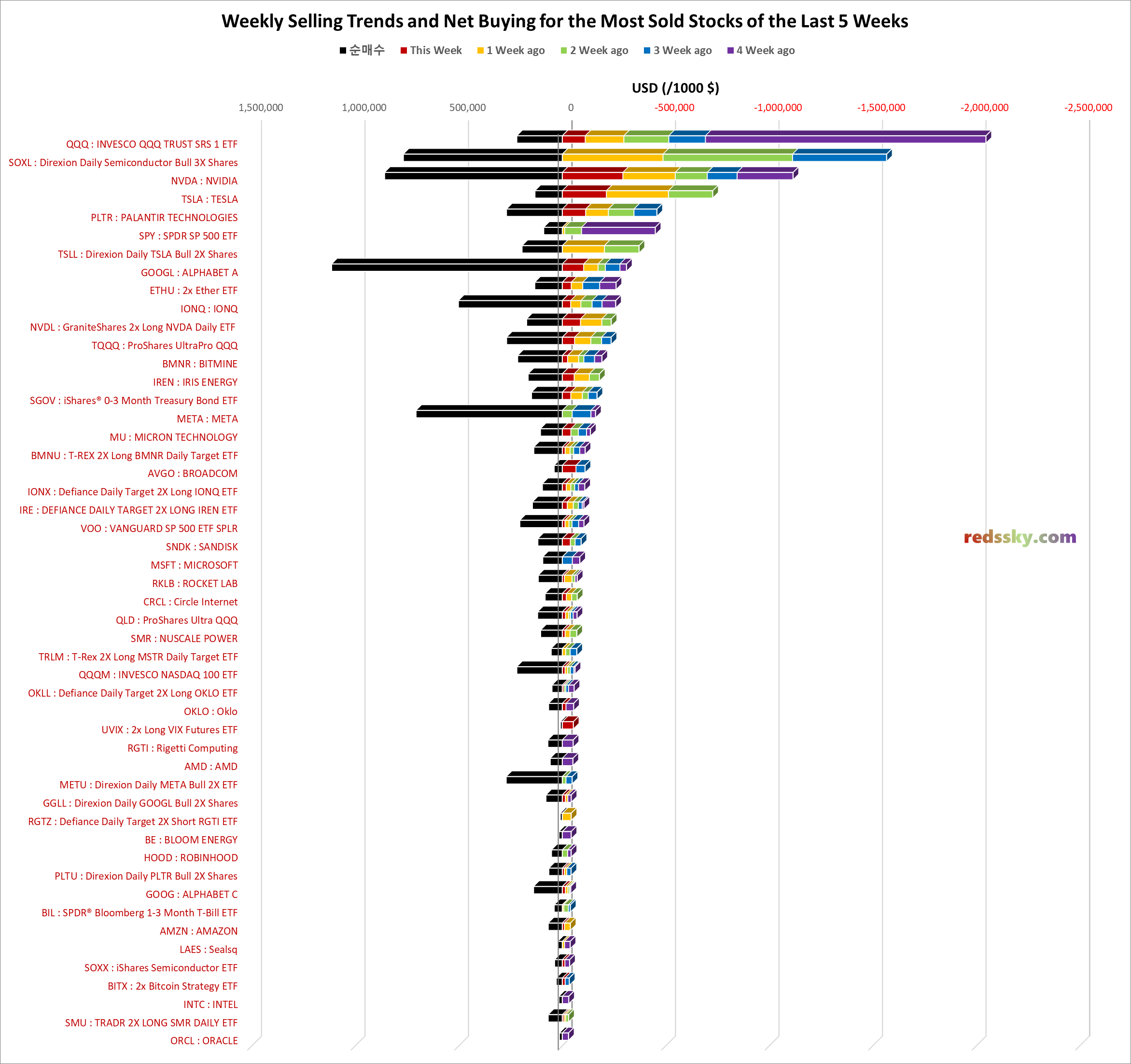 - 지난 5주간 상위 40 종목 중 QQQ > SOXL > NVDA > TSLA > PLTR 순으로 매도규모가 많았다.