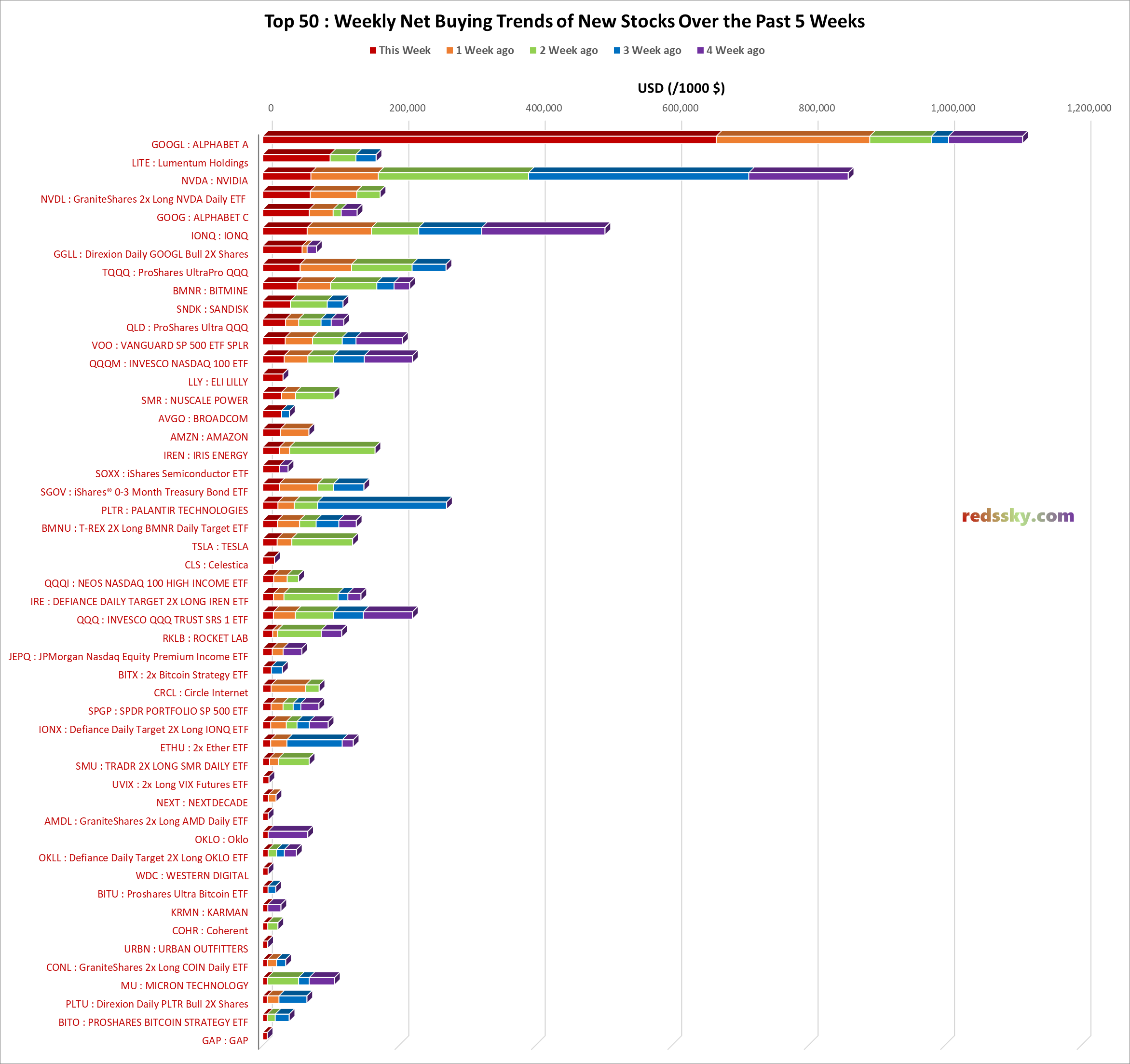 - 지난주에는 상위 50 종목 중 지난주에는 GOOGL > LITE > NVDA > NVDL > GOOG 순으로 순매수가 많았다.