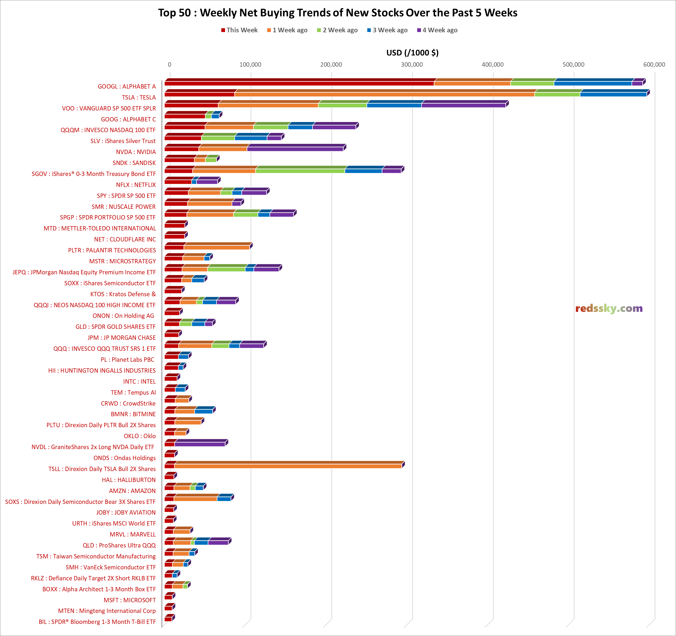 - 지난주에는 상위 50 종목 중 지난주에는 GOOGL > TSLA > VOO > GOOG > QQQM 순으로 순매수가 많았다.