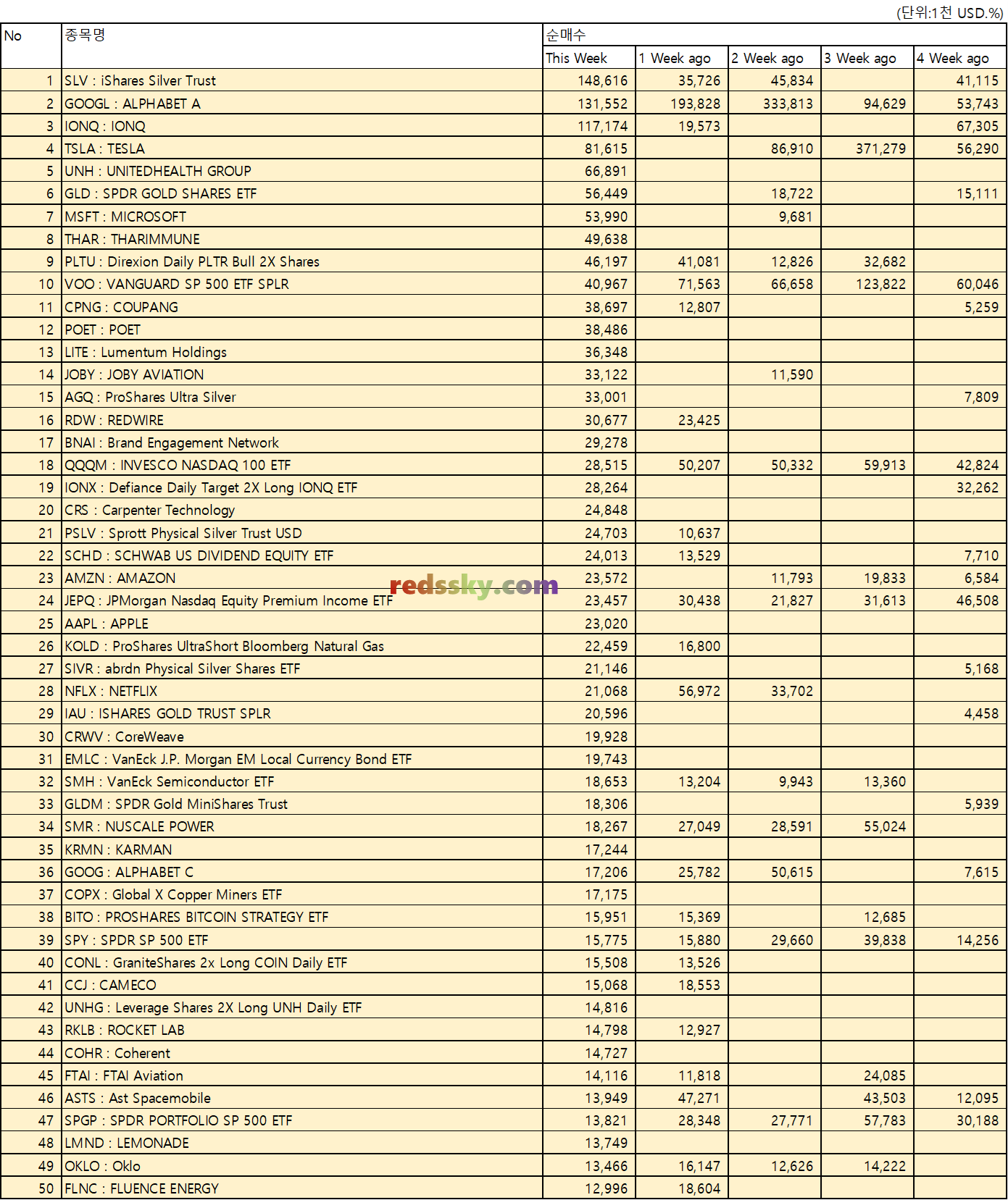 - 지난주에는 상위 50 종목 중 지난주에는 SLV > GOOGL > IONQ > TSLA > UNH 순으로 순매수가 많았다.