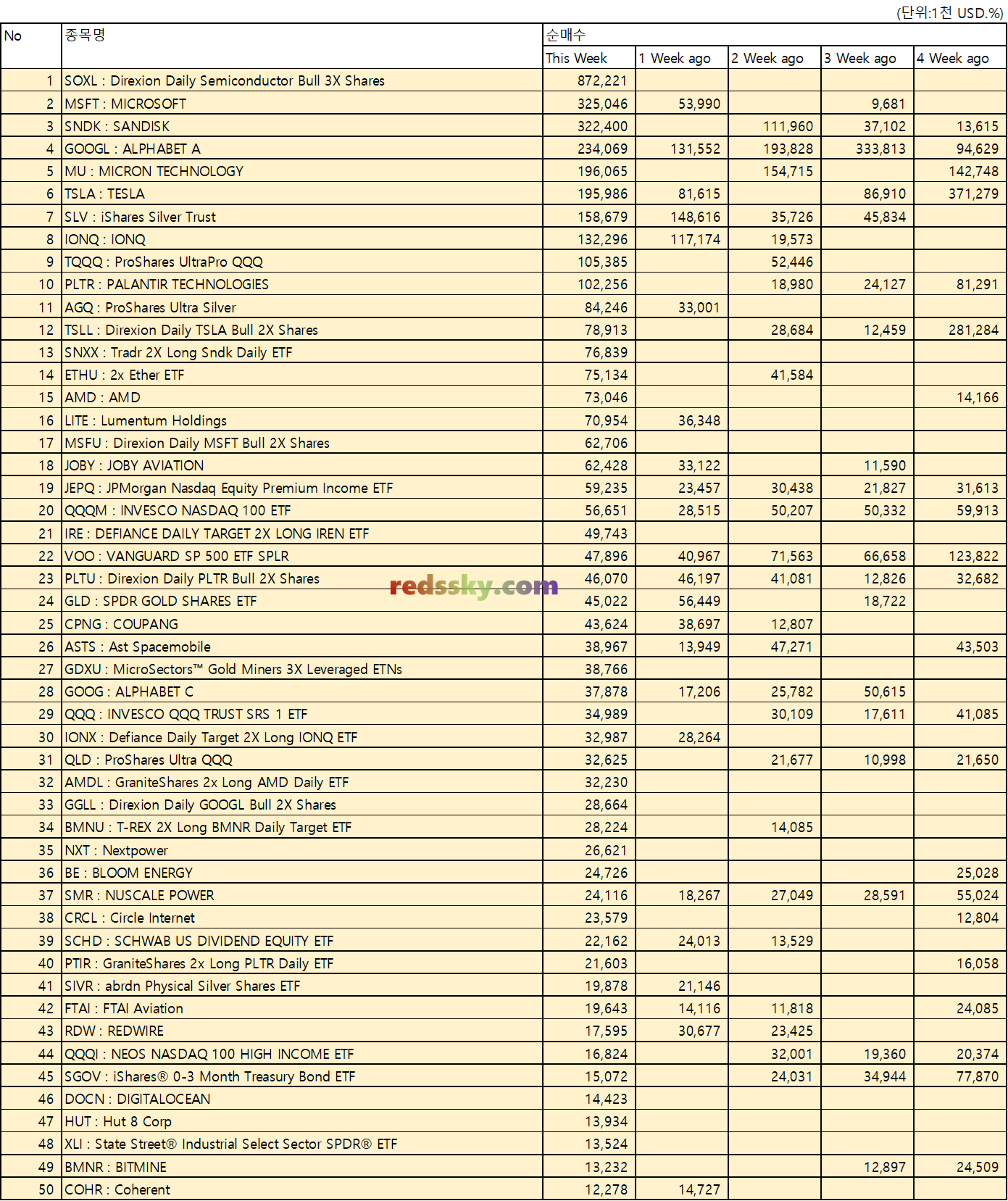 - 지난주에는 상위 50 종목 중 지난주에는 SOXL > MSFT > SNDK > GOOGL > MU 순으로 순매수가 많았다.