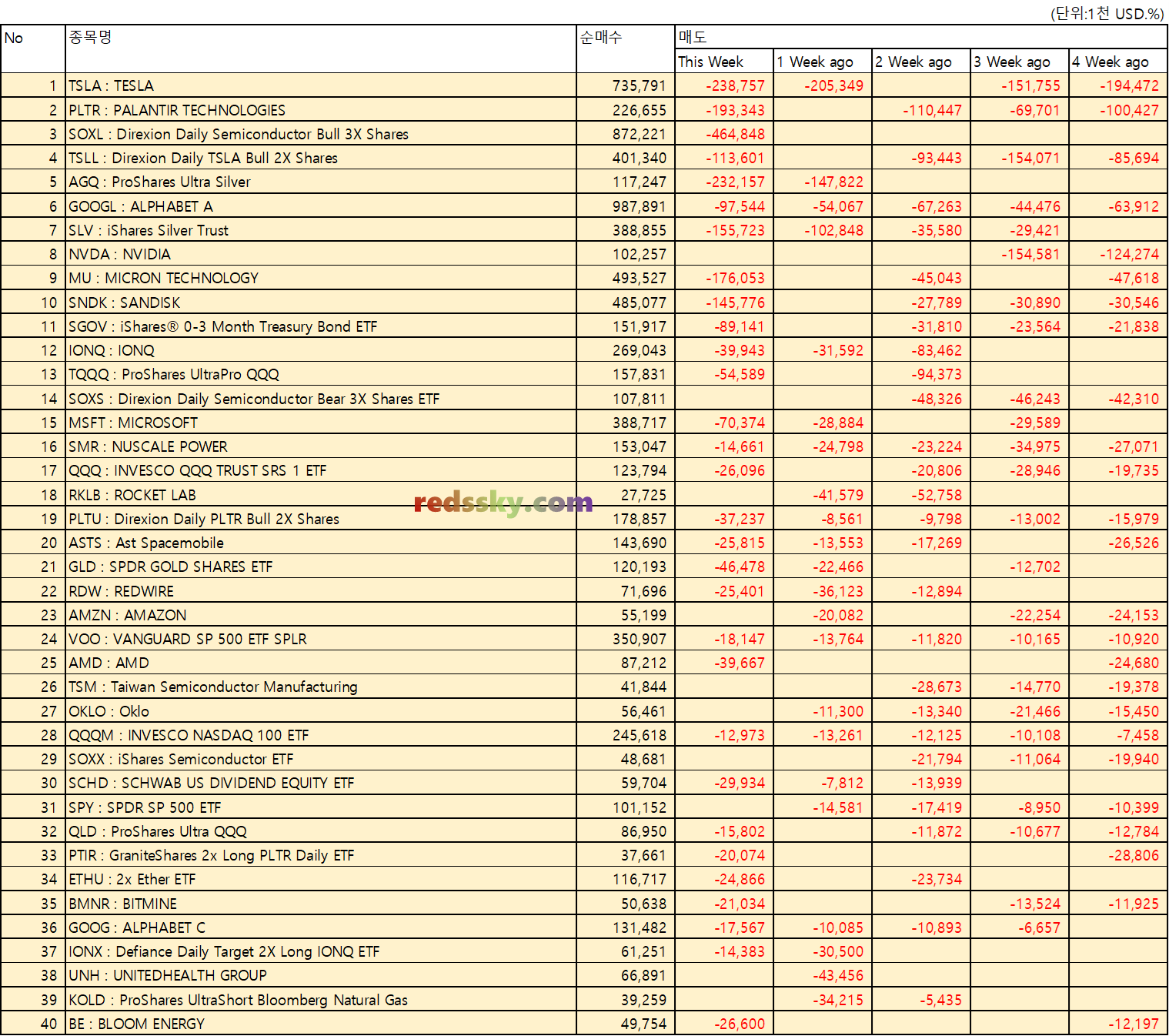 - 지난 5주간 상위 40 종목 중 TSLA > PLTR > SOXL > TSLL > AGQ 순으로 순매도규모가 많았다.