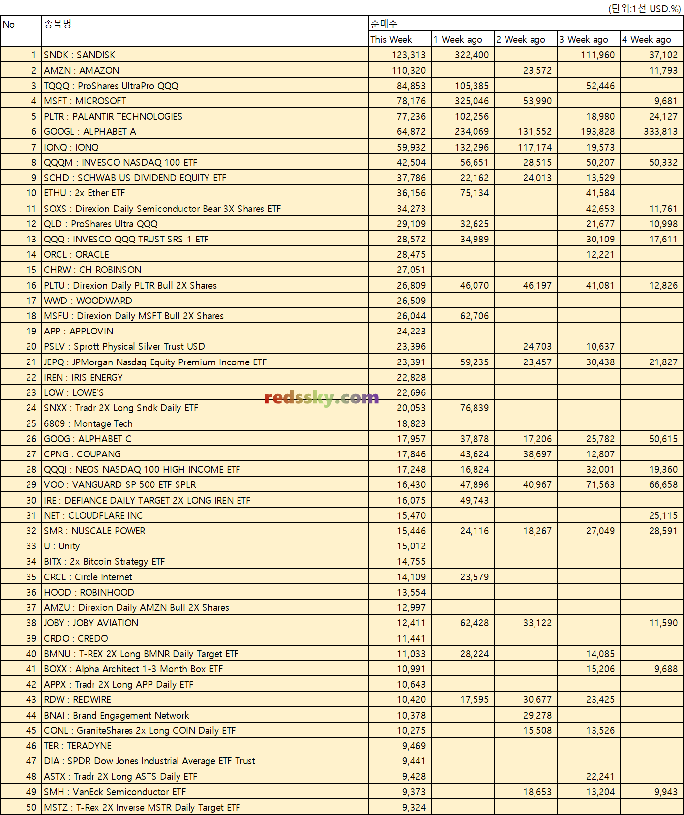 - 지난주에는 상위 50 종목 중 지난주에는 SNDK > AMZN > TQQQ > MSFT > PLTR 순으로 순매수가 많았다.