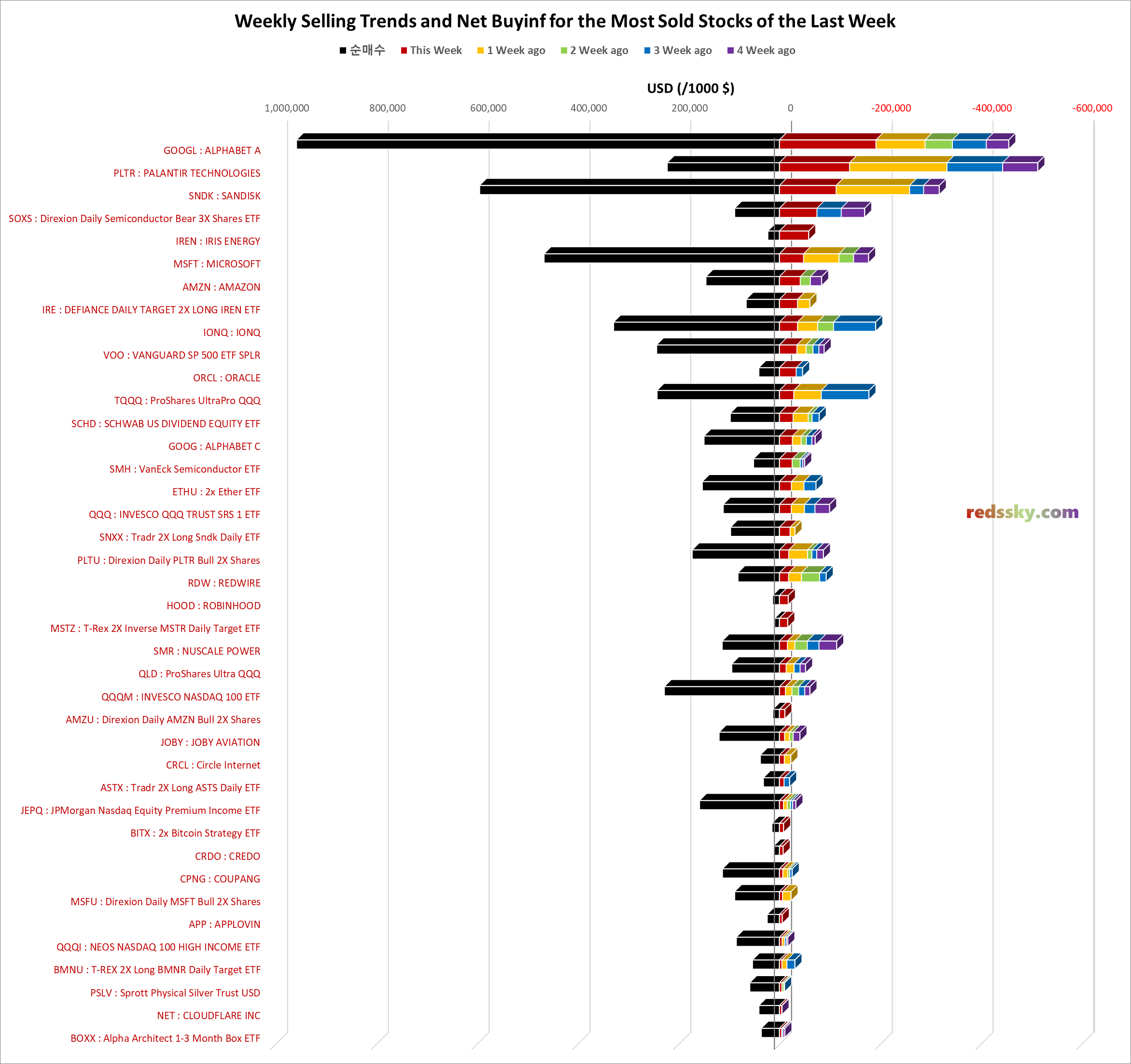 - 지난주는 GOOGL > PLTR > SNDK > SOXS > IREN 순으로 순매도가 있었다.