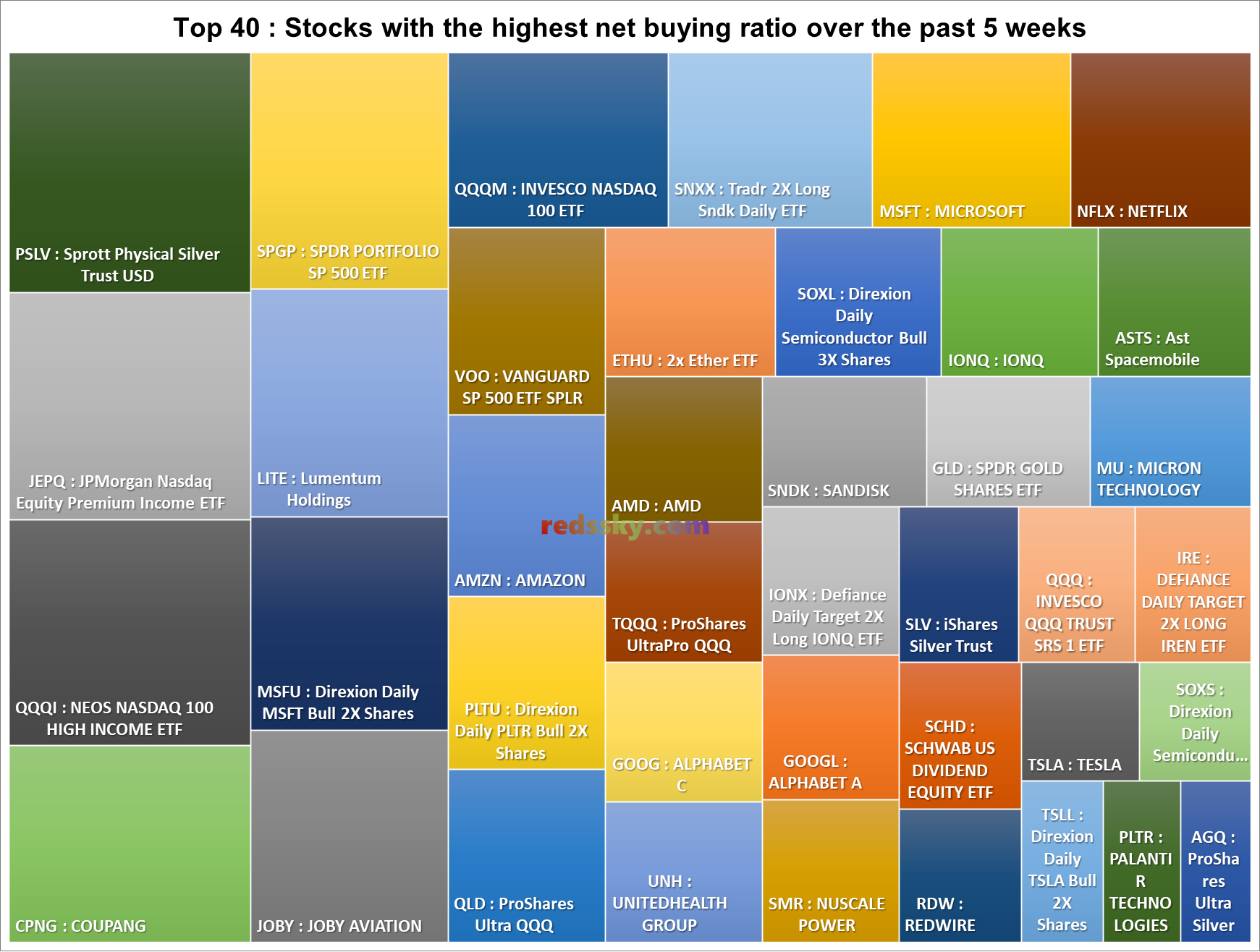 - 상위 40 종목 중 지난 5주동안 SOXL > GOOGL > SNDK > MSFT > MU 순으로 순매수되었다.