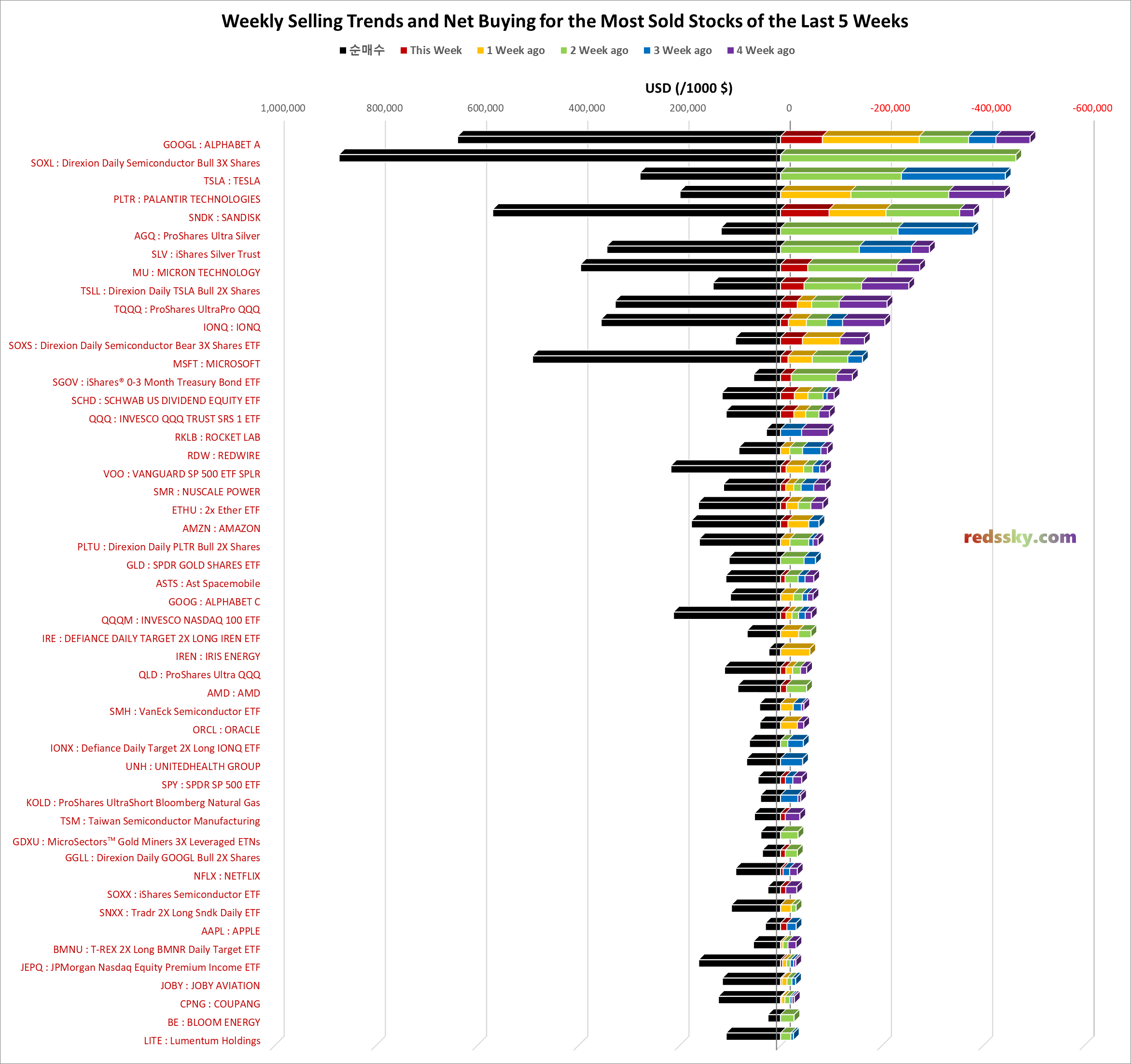 - 지난주는 SNDK > GOOGL > MU > TSLL > SOXS 순으로 순매도가 있었다.
