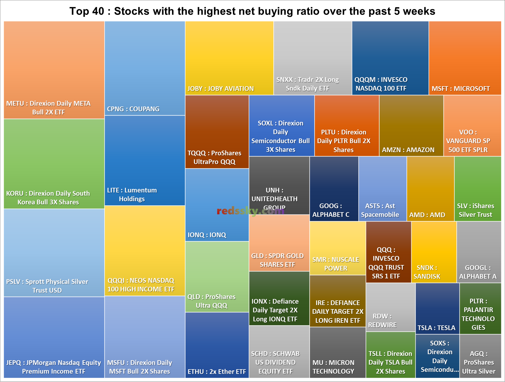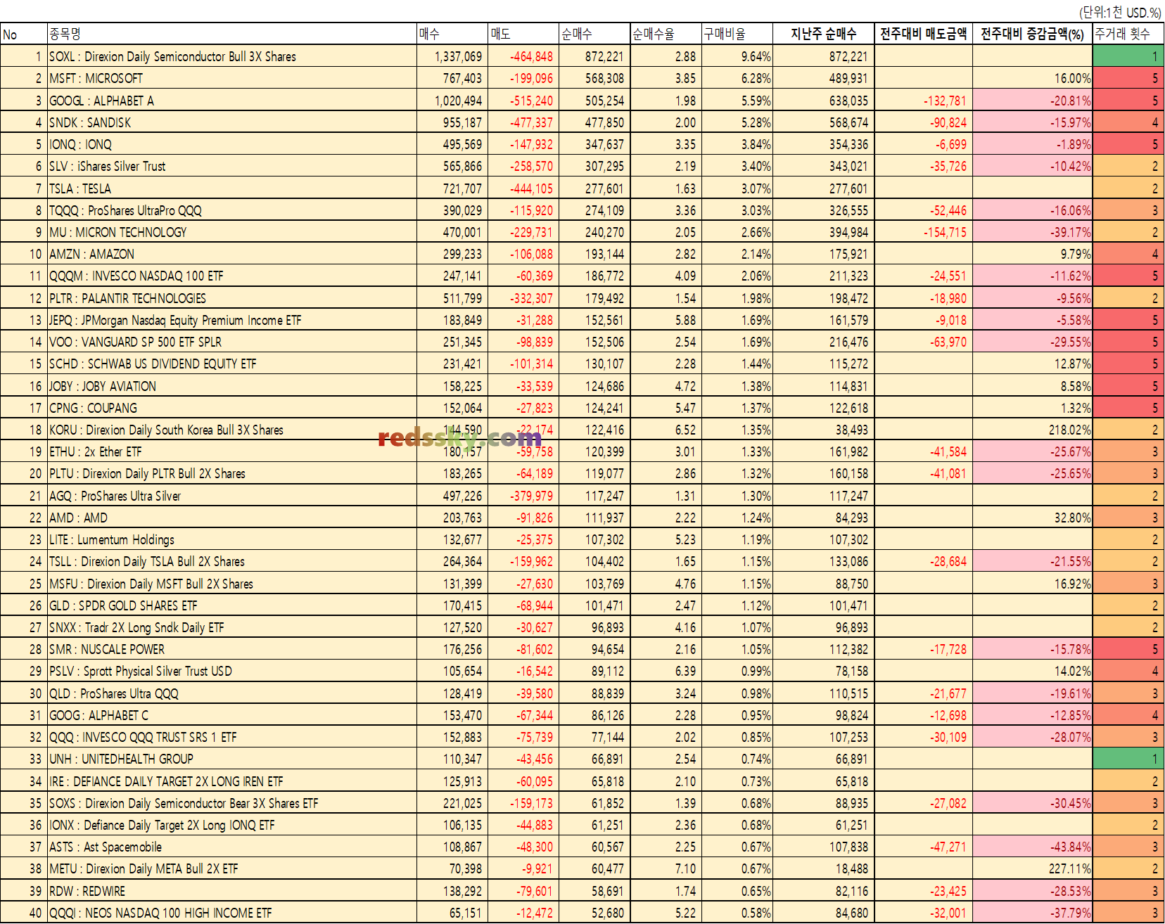 - 상위 40 종목 중 지난 5주동안 SOXL > MSFT > GOOGL > SNDK > IONQ 순으로 순매수되었다.